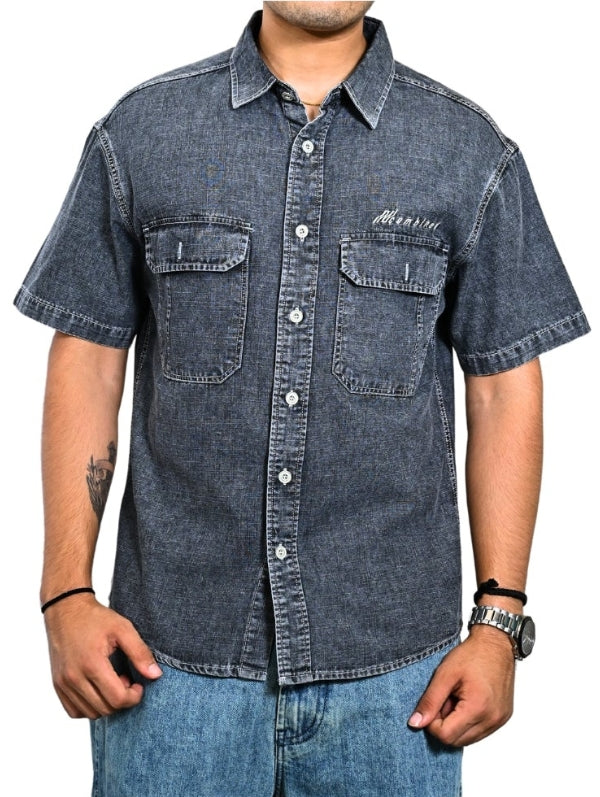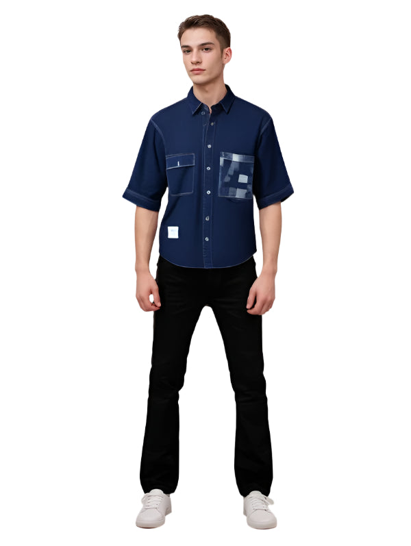 Men's solid casual half-sleeves shirt in denim-look cotton fabric: stylish, comfortable, versatile. Perfect for a...