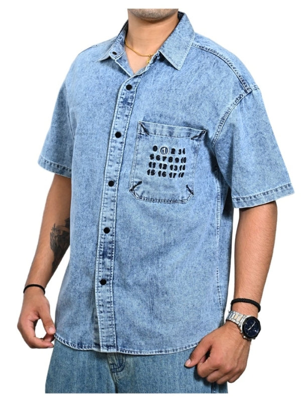 Men's solid casual half-sleeves shirt in denim-look cotton fabric: stylish, comfortable, versatile. Perfect for a...