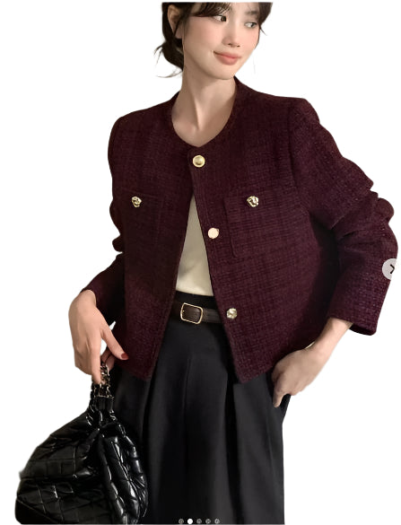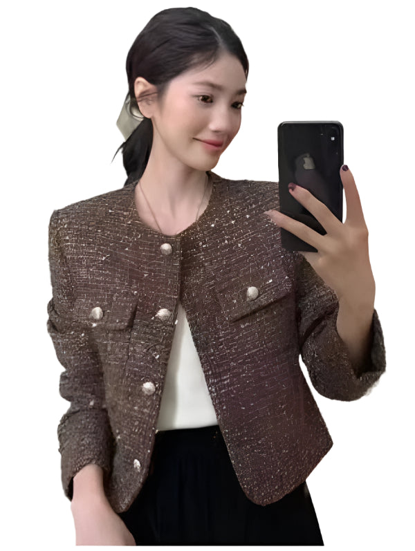 This tweed fabric jacket features a zipper closure and a Chinese neck. Its stylish design...