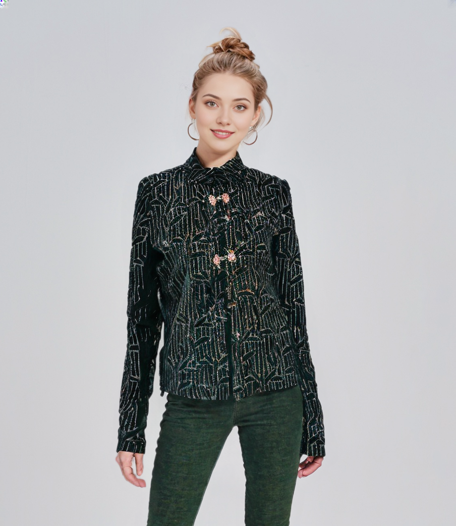This versatile denim jacket features stylish sequined accents, adding a touch of glamour to any...