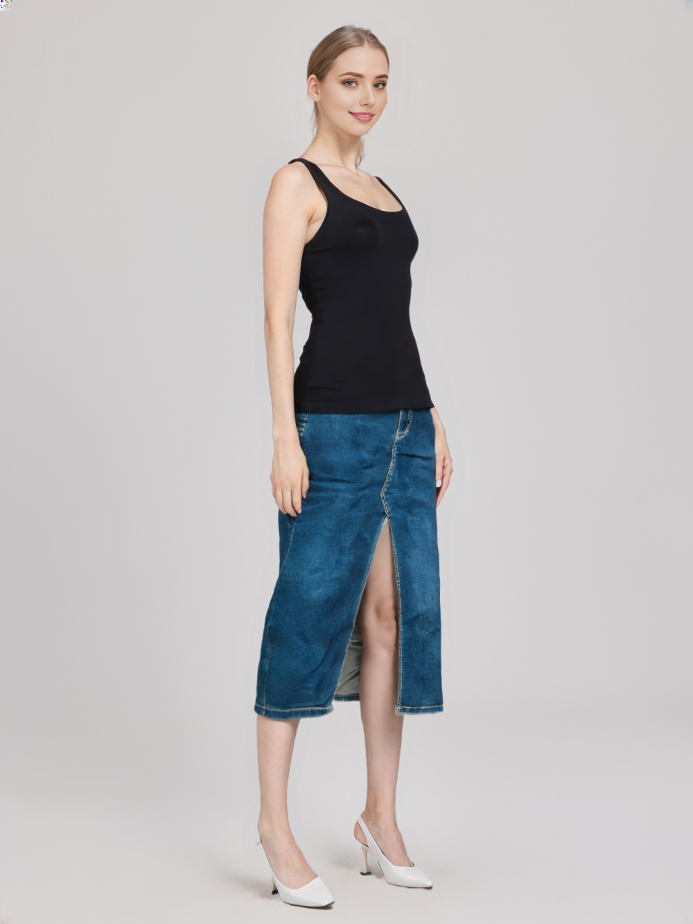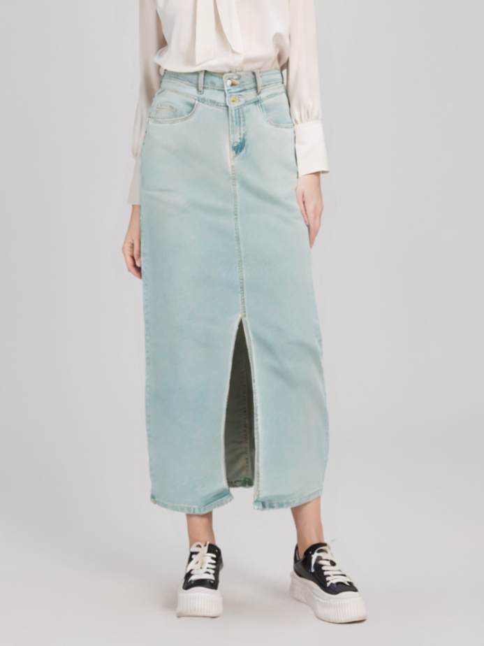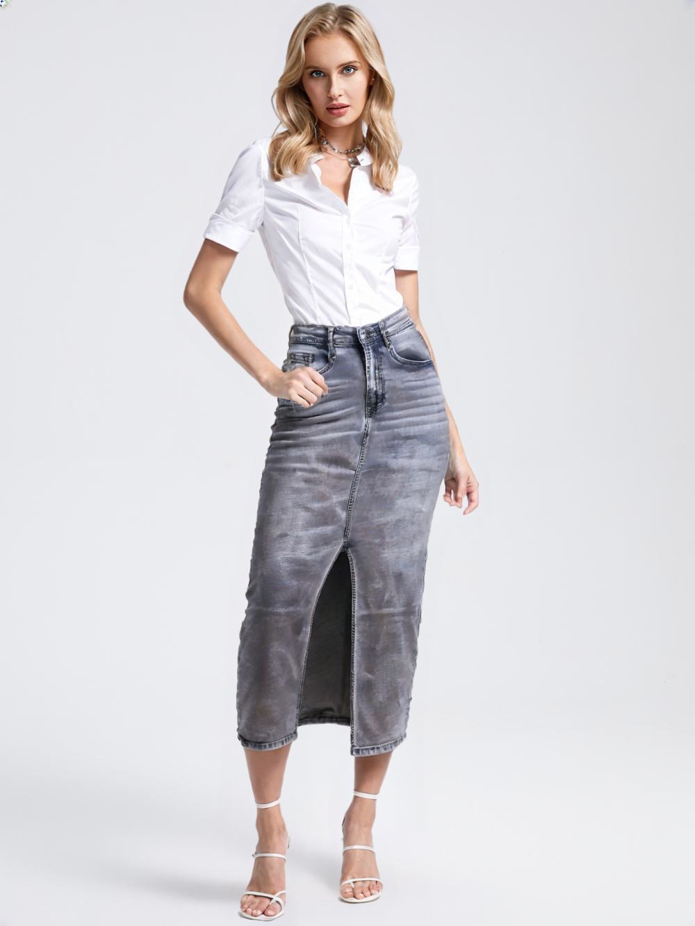 Women's Denim Skirt front cut knee above length stylish and versatile piece that can be...