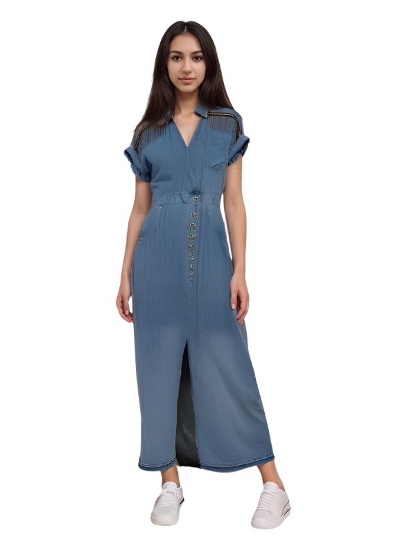 This women's mini dress is made from a combination of denim and lycra fabric, resulting...