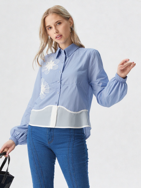 This women's button-down shirt features delicate white floral embroidery, adding a touch of elegance to...