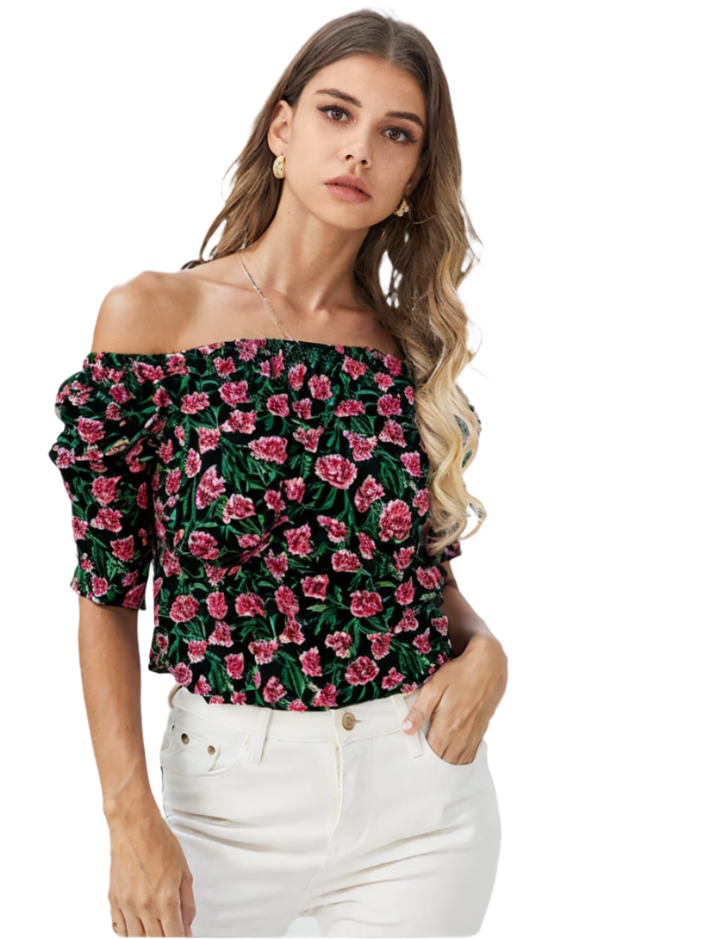 This printed top offers a chic, off-the-shoulder design that is perfect for any stylish woman....