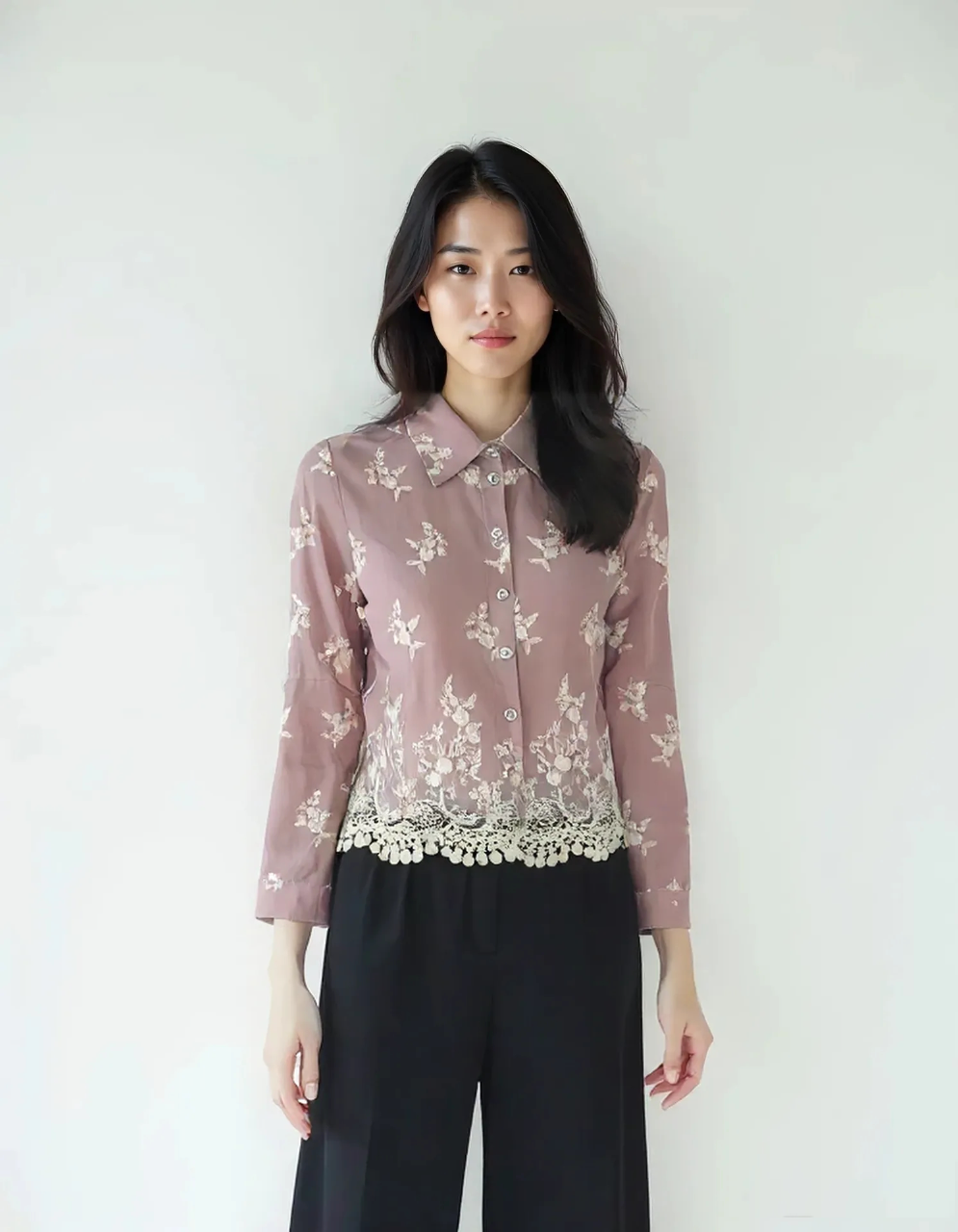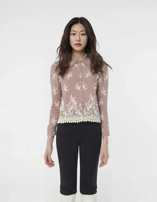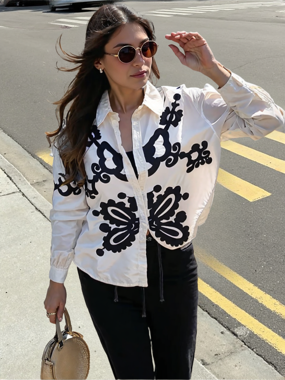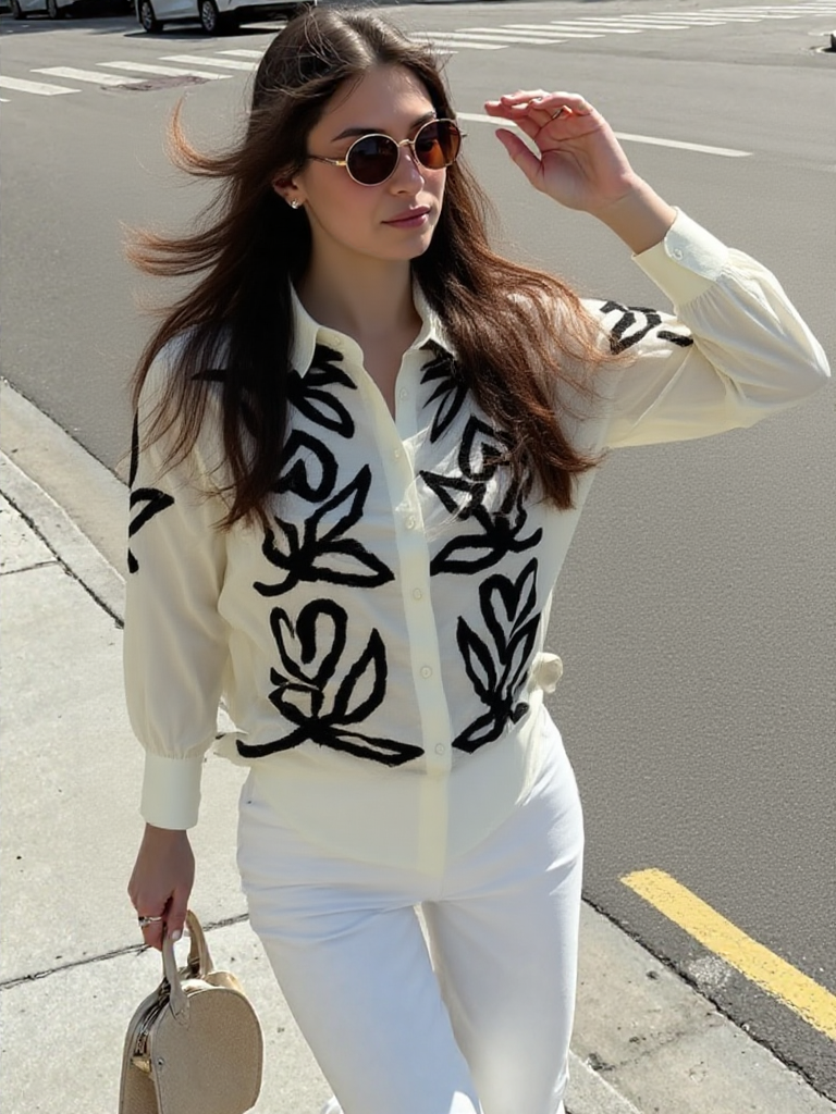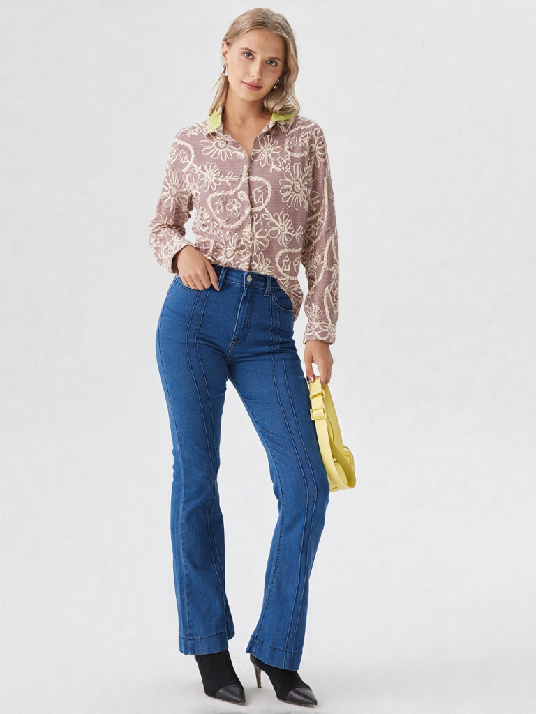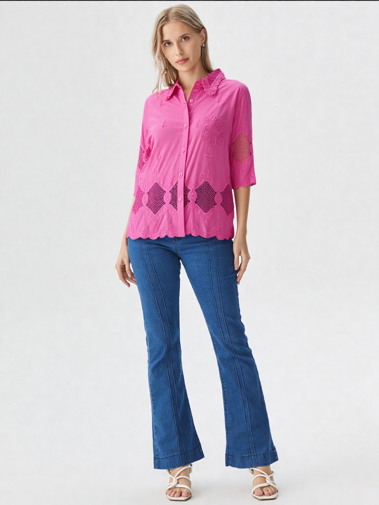 This women's button-down shirt features delicate white floral embroidery, adding a touch of elegance to...