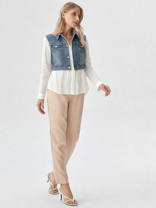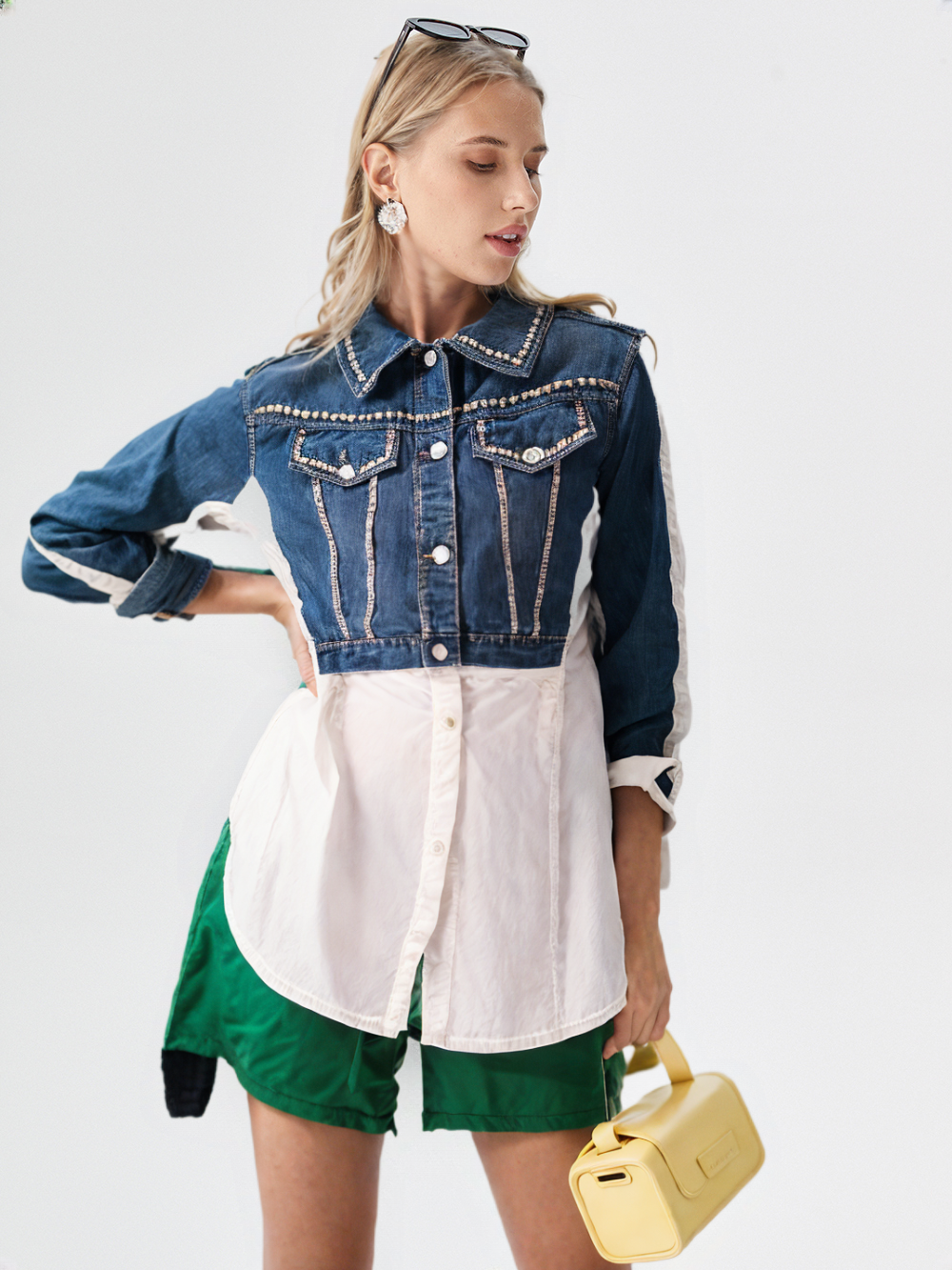 This stylish women's shirt is expertly crafted with a blend of denim and white fabric....
