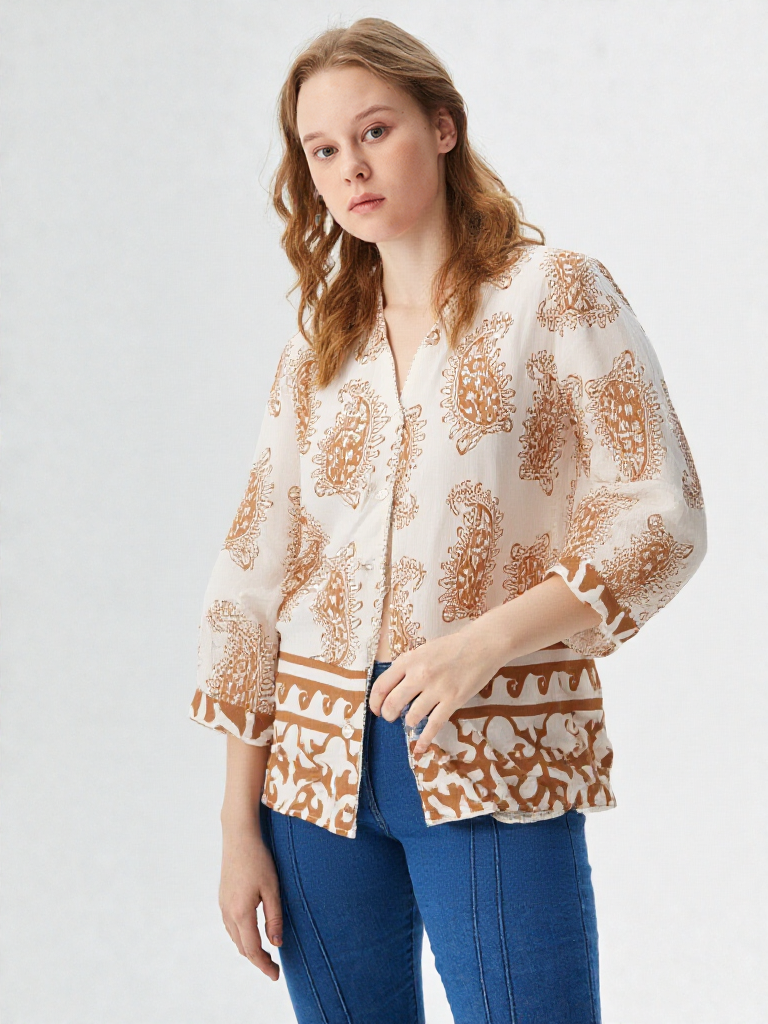 This women's cotton shirt features a v-neck and 3/4 sleeves, providing both style and comfort....