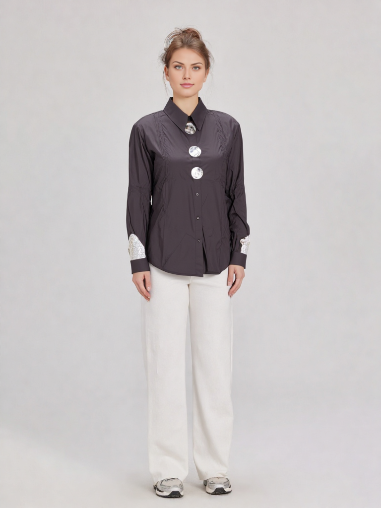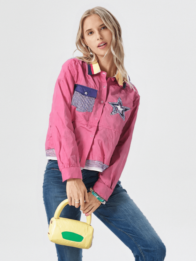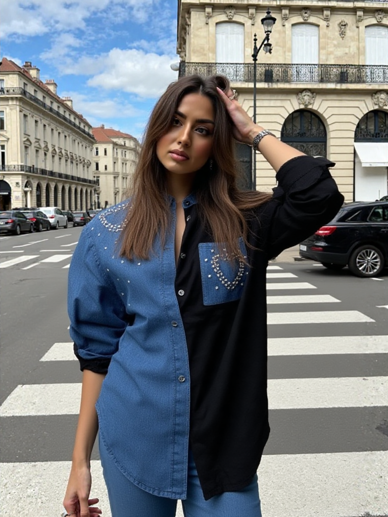 Women's Oversized Metal Buttons & Distressed Denim Patch Sleeves Shirt