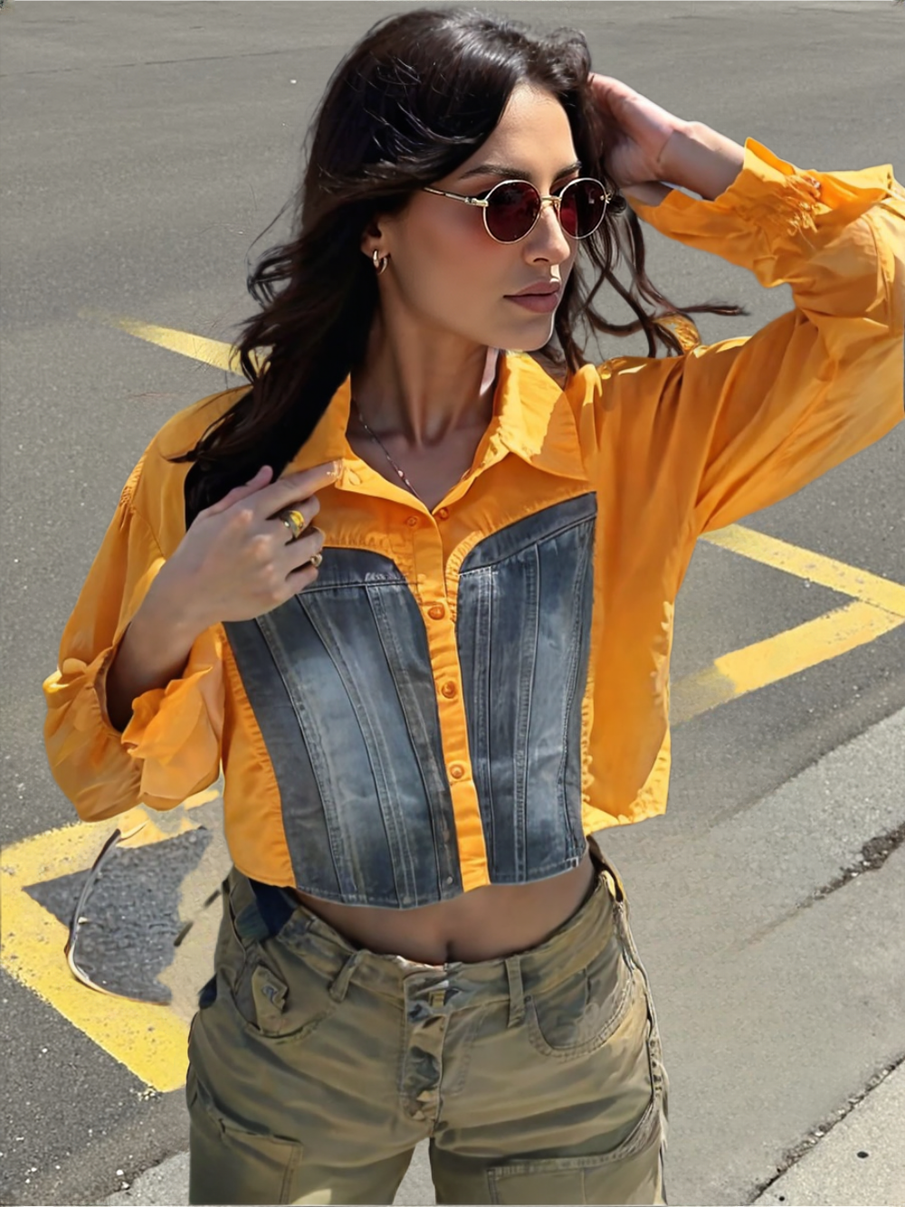 This Women's Colorblock Denim Sleeve Shirt is a versatile and stylish addition to any wardrobe....