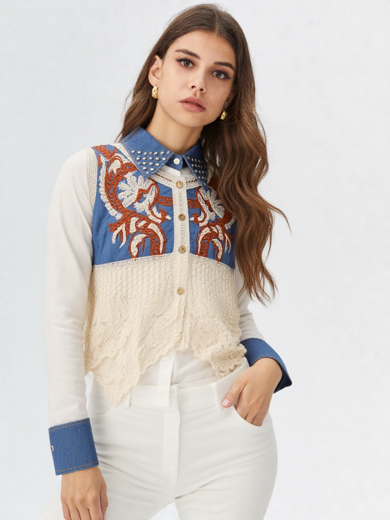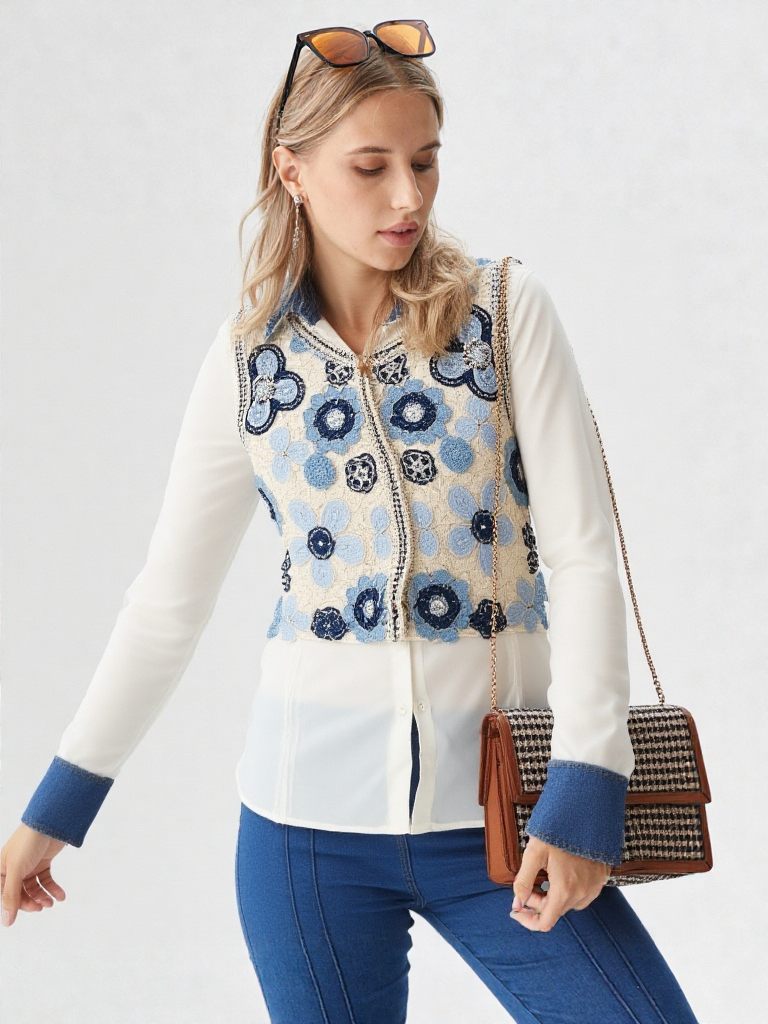 This women's cotton denim tunic features a delicate floral print, combining comfort with timeless style....