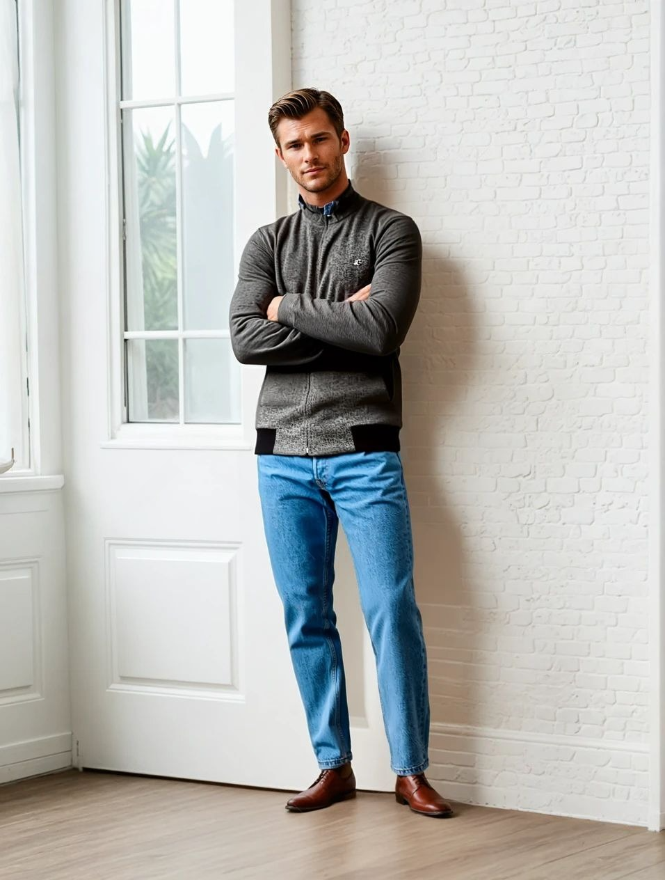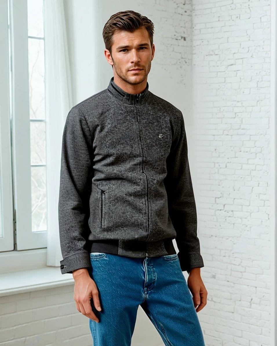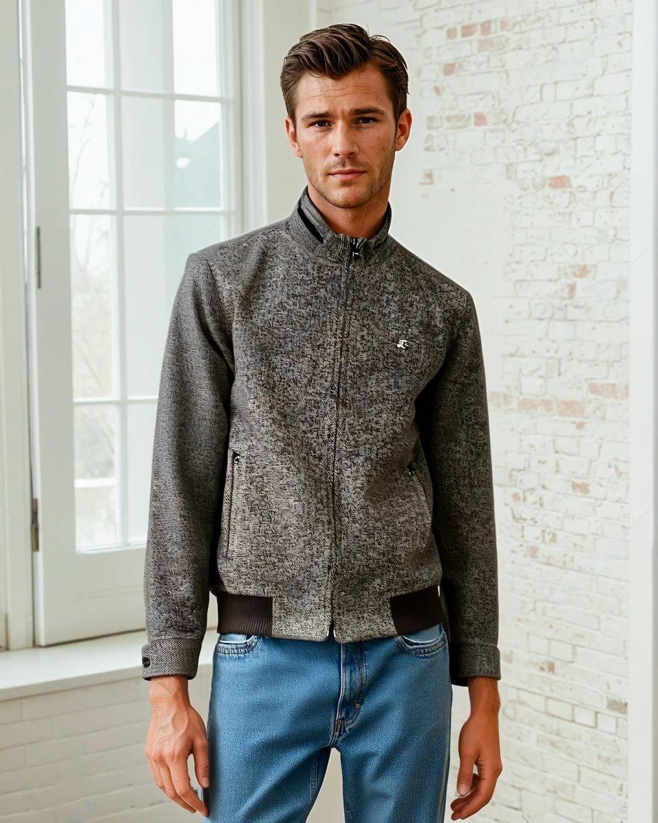 This tweed fabric jacket features a zipper closure and a Chinese neck. Its stylish design offers a comfortable and trendy fit for men. Made from high-quality materials, this jacket is perfect for any occasion and will keep you warm while adding a touch of sophistication to your outfit.