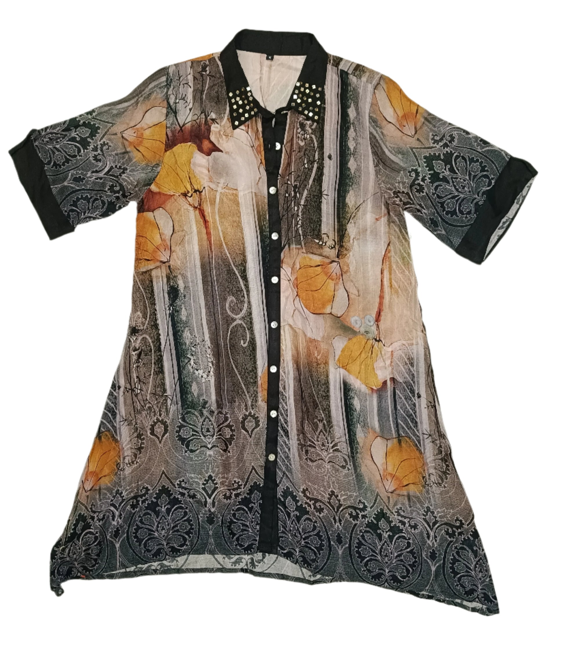 This elegant co-ord set features a printed asymmetrical tunic with a striking autumn leaf design and intricate patterns. The button-down front and studded collar add a stylish touch. Paired with classic black relaxed-fit pants, this ensemble offers both comfort and sophistication, making it perfect for casual outings or festive occasions.