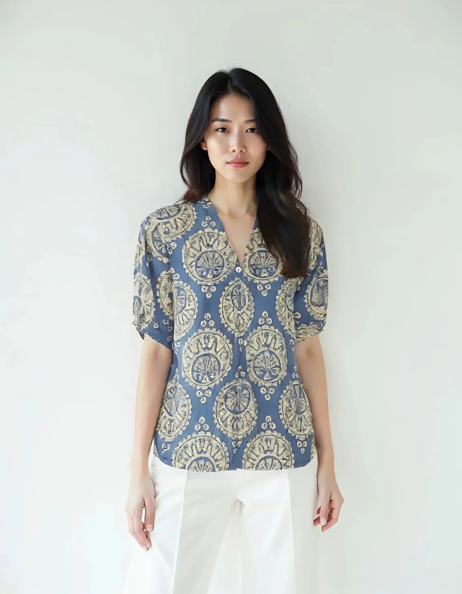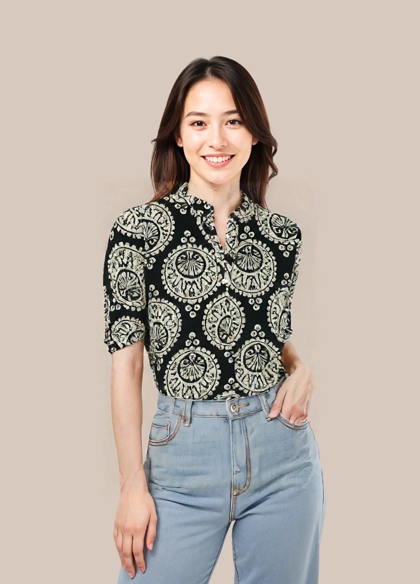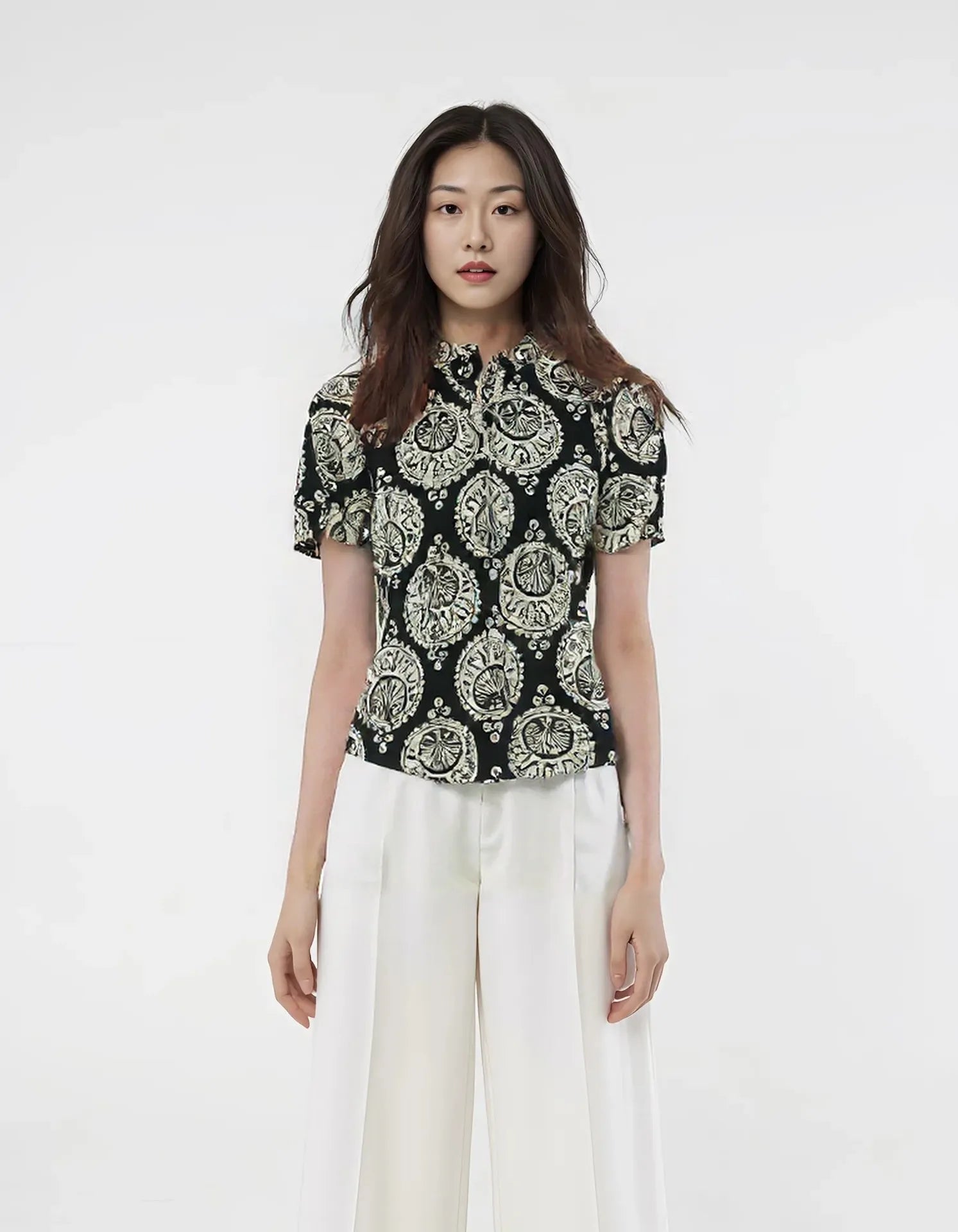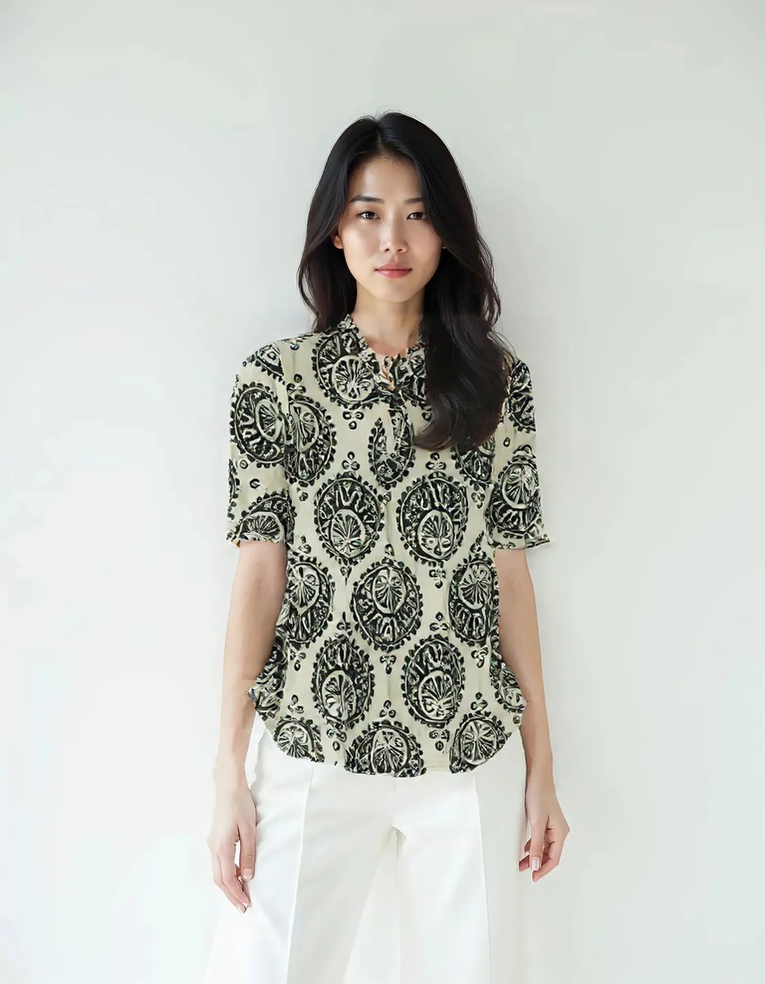 This women's top demonstrates exceptional technical execution in both design and construction. The precisely calibrated fit accommodates anatomical variations while maintaining aesthetic integrity. Advanced textile selection provides optimal performance characteristics including breathability, shape retention, and tactile comfort. Strategic reinforcement at high-stress points ensures durability without compromising the garment's refined silhouette. The versatile design architecture allows for multiple styling applications across various contextual requirements, making it an efficient wardrobe investment.