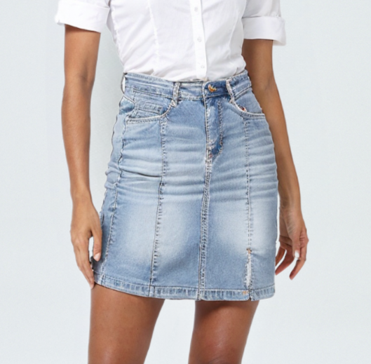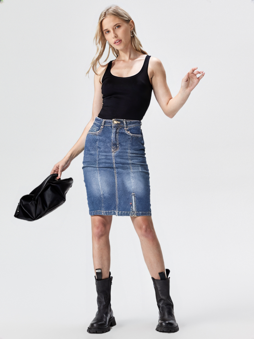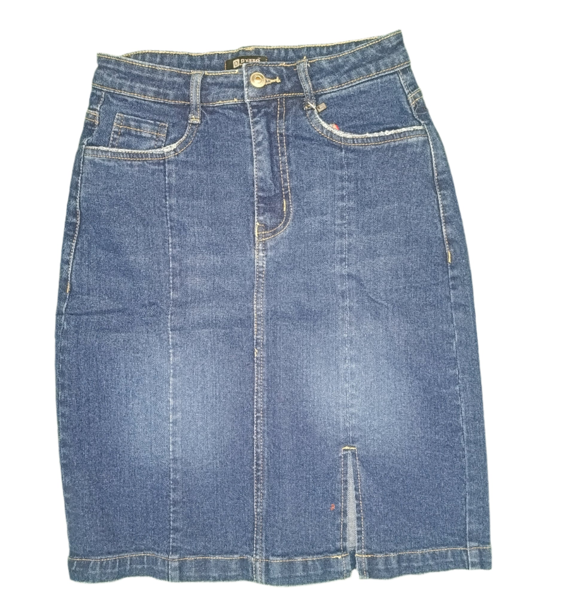 This classic denim skirt combines a timeless design with modern versatility. Featuring a structured fit with contrast stitching, it offers a flattering and stylish look. The skirt includes a front button and zip closure, along with functional pockets for added convenience. A subtle front slit enhances ease of movement while maintaining a sleek, polished appearance. Perfect for casual outings or dressed-up ensembles, this piece is a wardrobe essential for effortless styling.