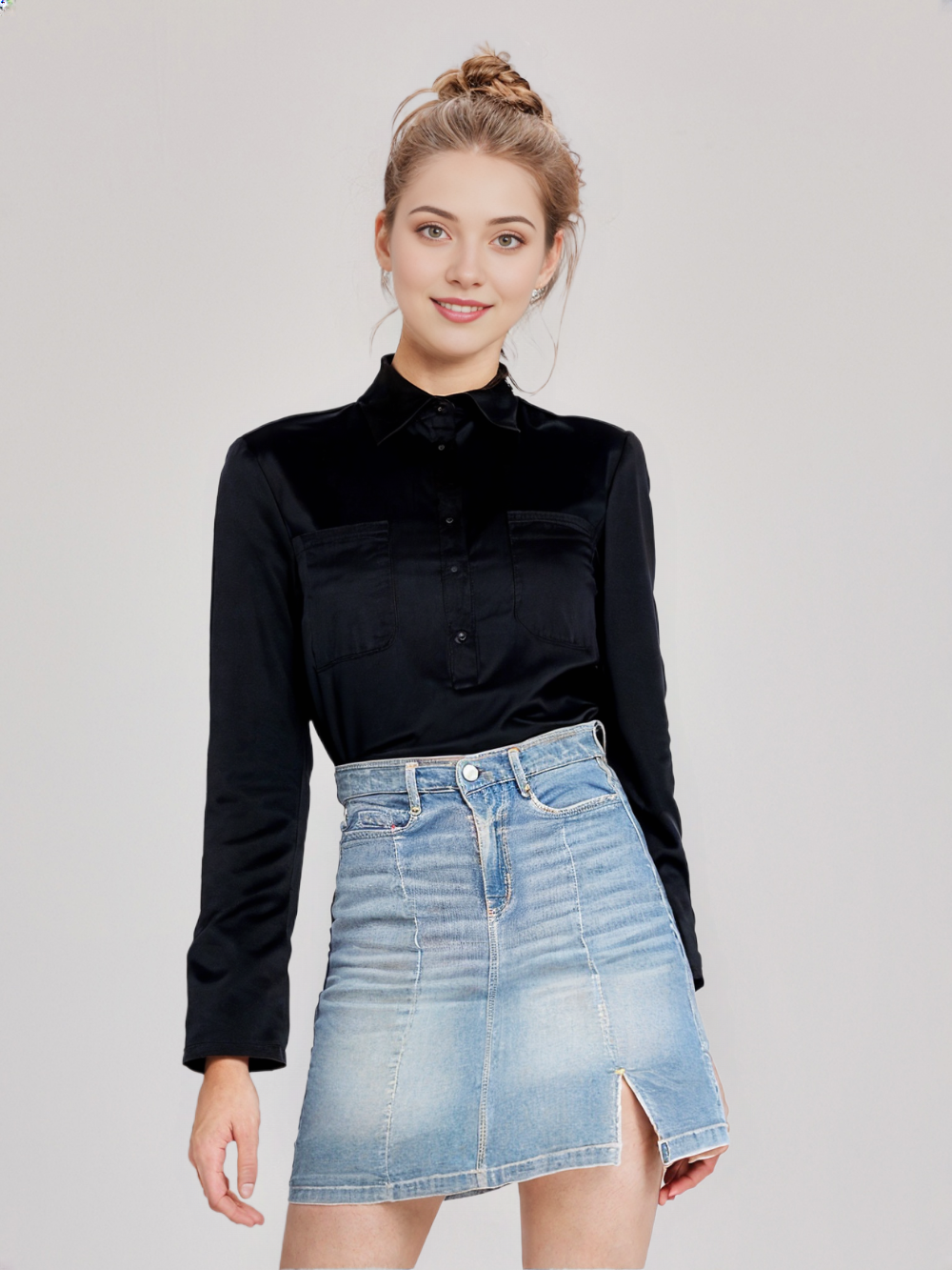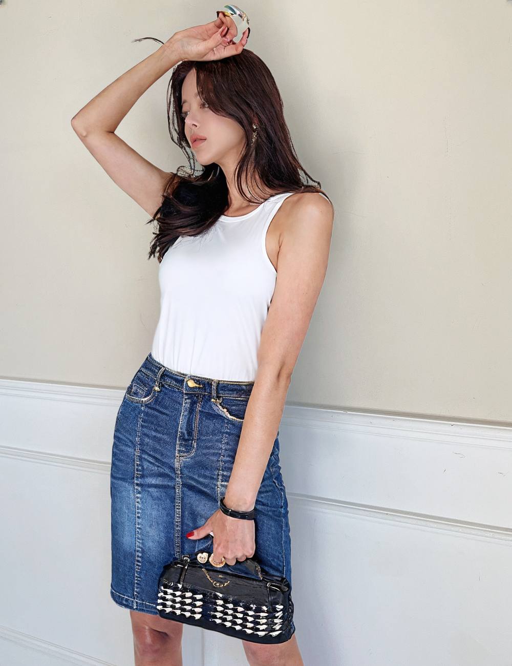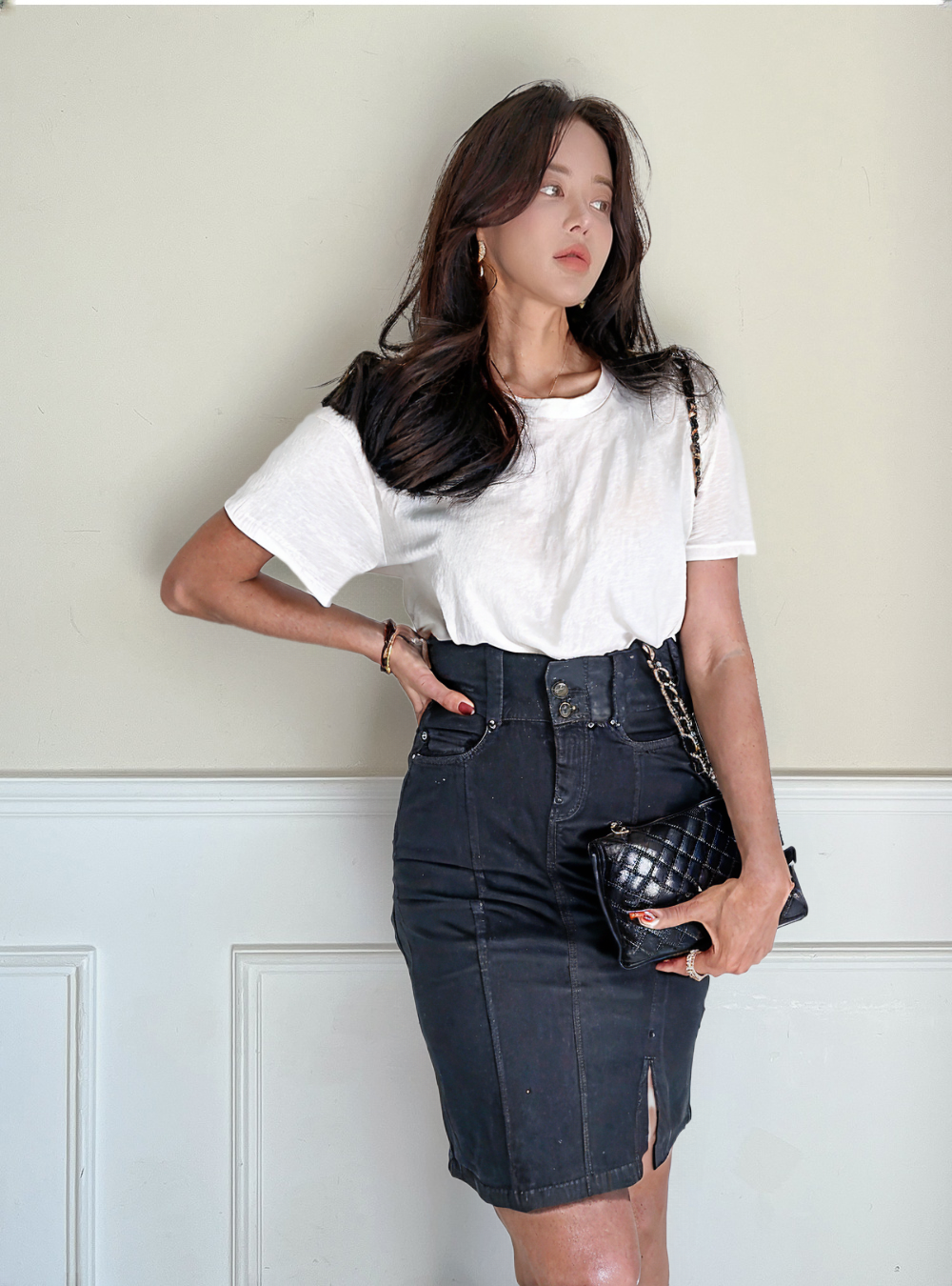 This classic denim skirt combines a timeless design with modern versatility. Featuring a structured fit with contrast stitching, it offers a flattering and stylish look. The skirt includes a front button and zip closure, along with functional pockets for added convenience. A subtle front slit enhances ease of movement while maintaining a sleek, polished appearance. Perfect for casual outings or dressed-up ensembles, this piece is a wardrobe essential for effortless styling.