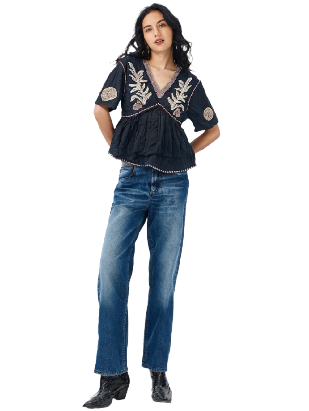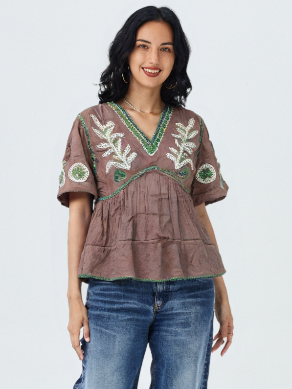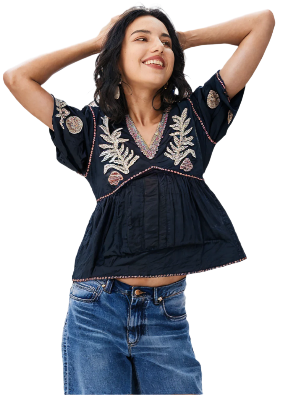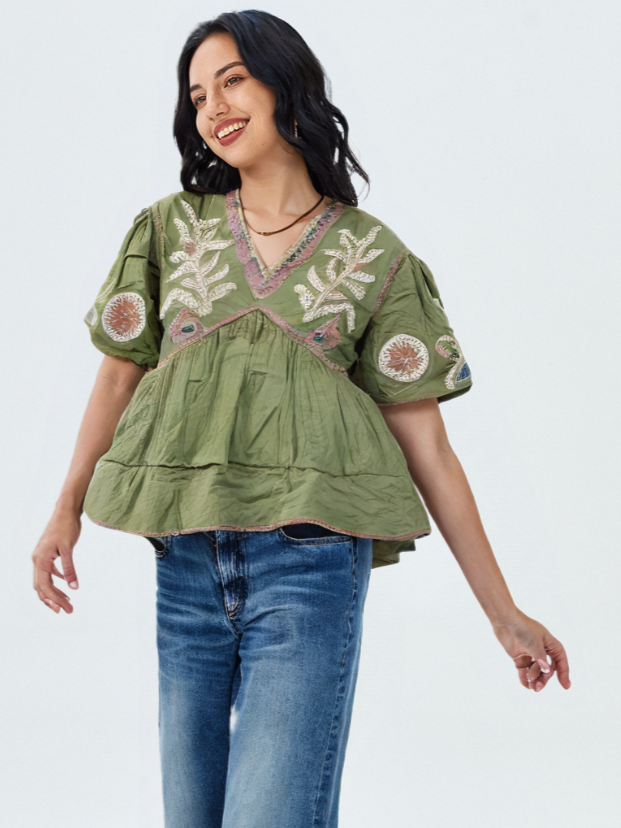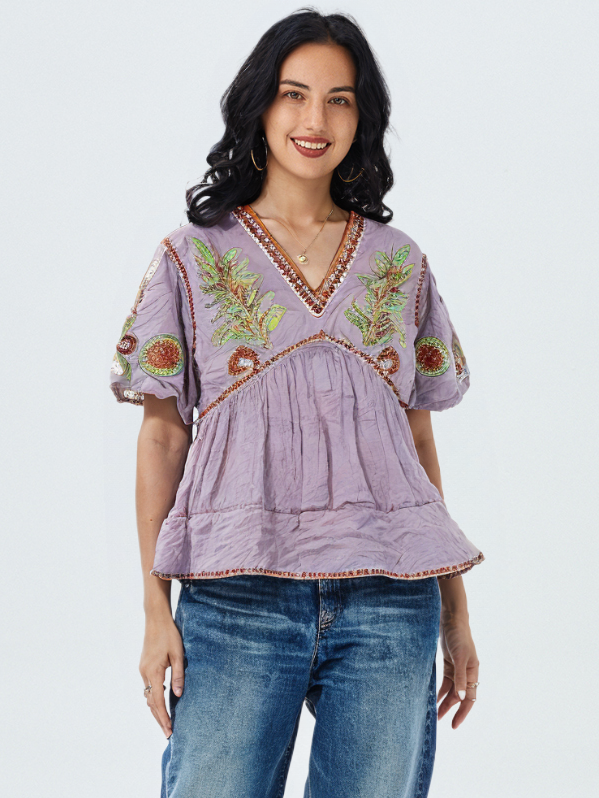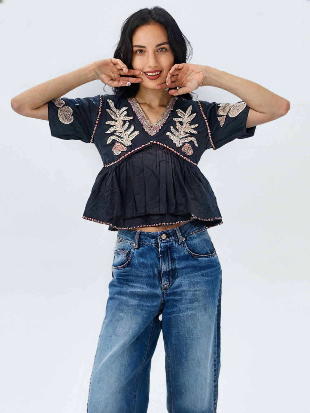 Embroidered V-Neck Boho Top – Flowy & Eye-Catching