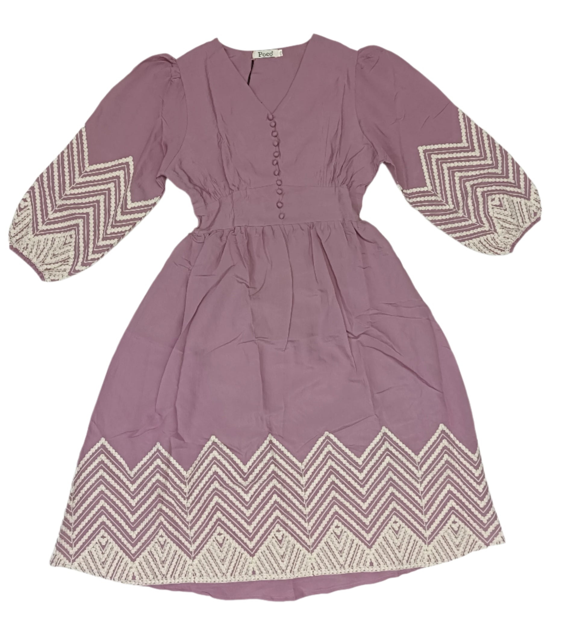 This beautifully crafted midi dress blends timeless elegance with contemporary flair. Featuring a flattering V-neckline, fabric-covered front buttons, and intricate embroidery on the sleeves and hemline, it’s the perfect pick for brunches, day events, or a relaxed evening out.