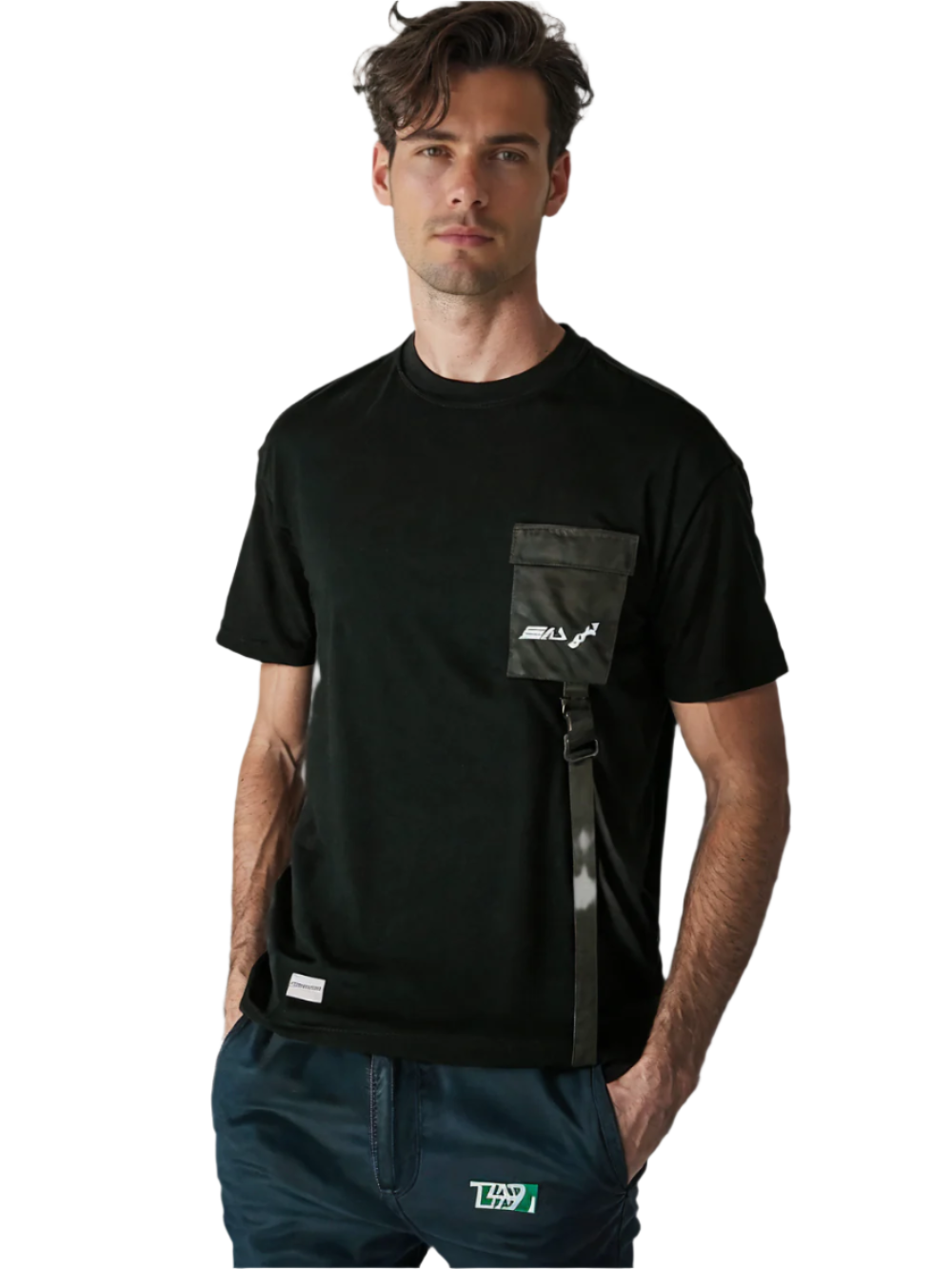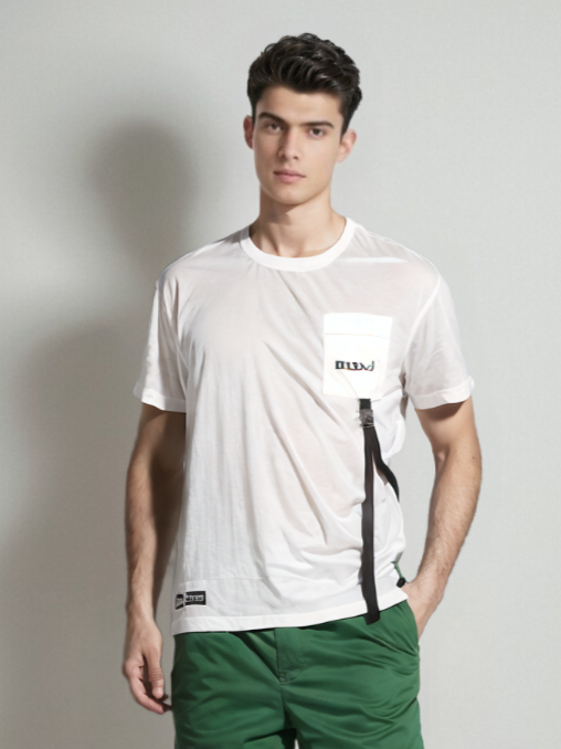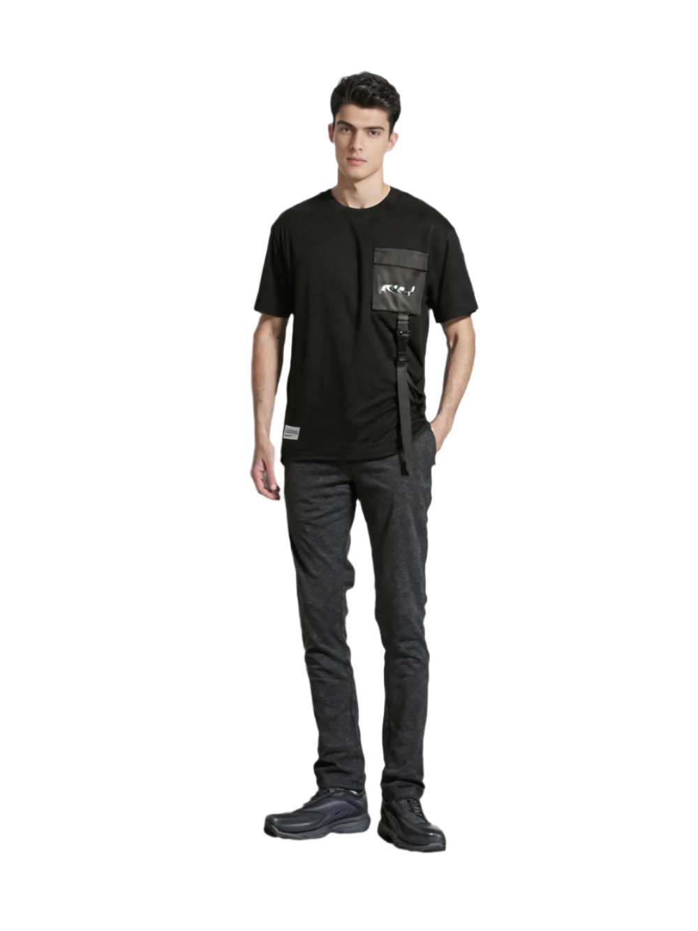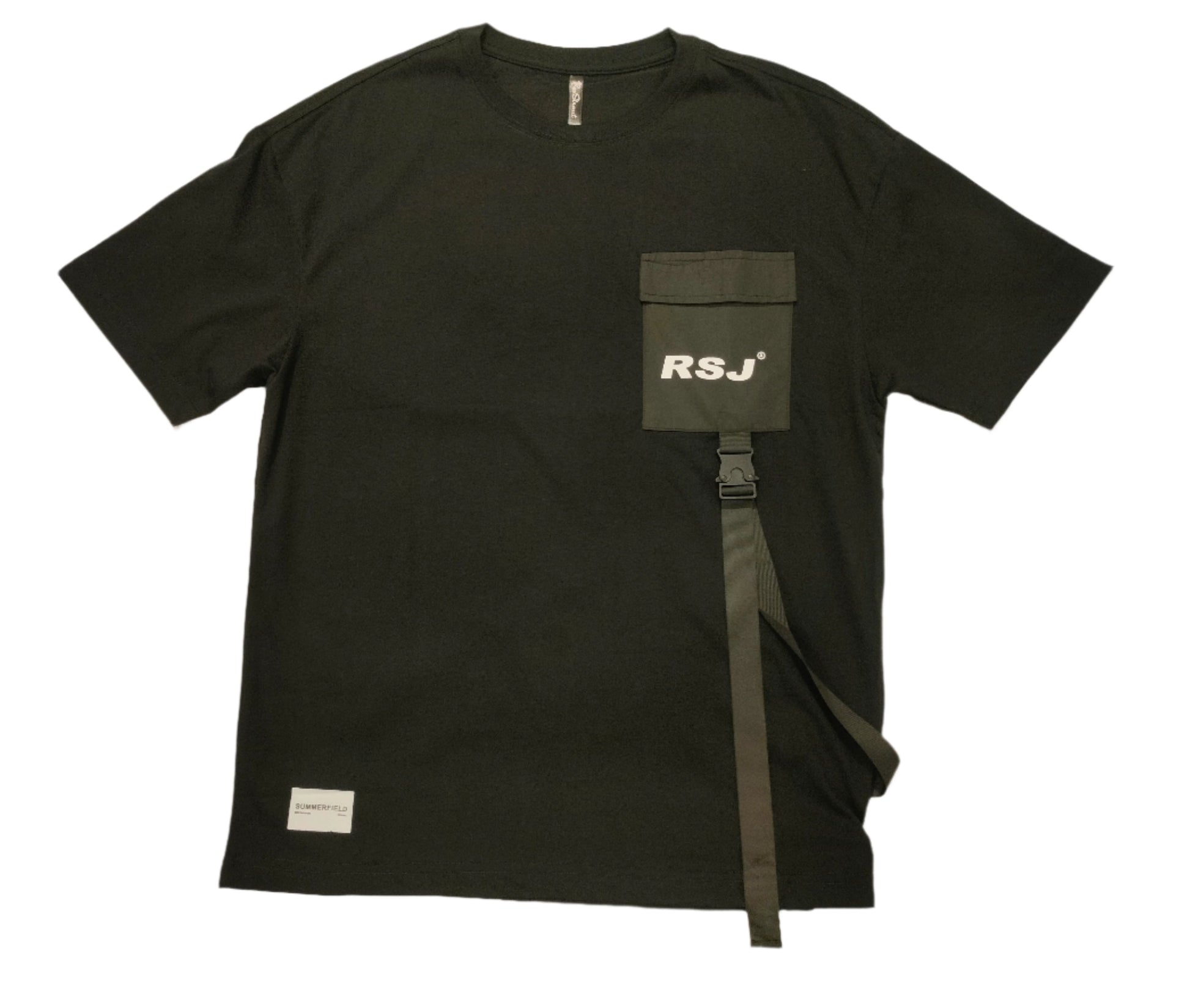 Elevate your casual wear with this ultra-modern t-shirt designed for those who dare to be different. Featuring a bold utility-inspired front pocket with "RSJ®" branding and an attached adjustable strap detail, this tee blends fashion-forward design with functional flair.