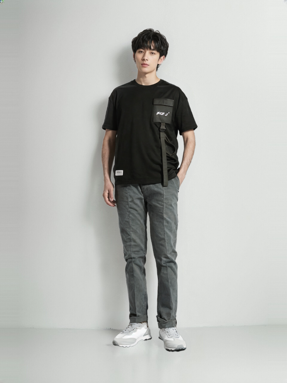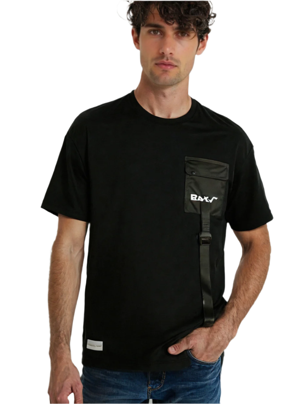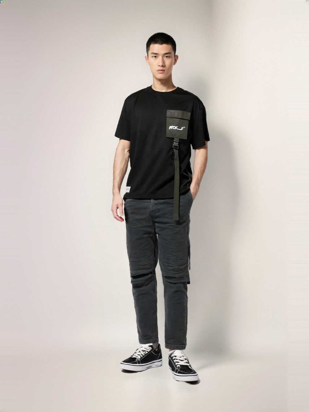Elevate your casual wear with this ultra-modern t-shirt designed for those who dare to be different. Featuring a bold utility-inspired front pocket with "RSJ®" branding and an attached adjustable strap detail, this tee blends fashion-forward design with functional flair.