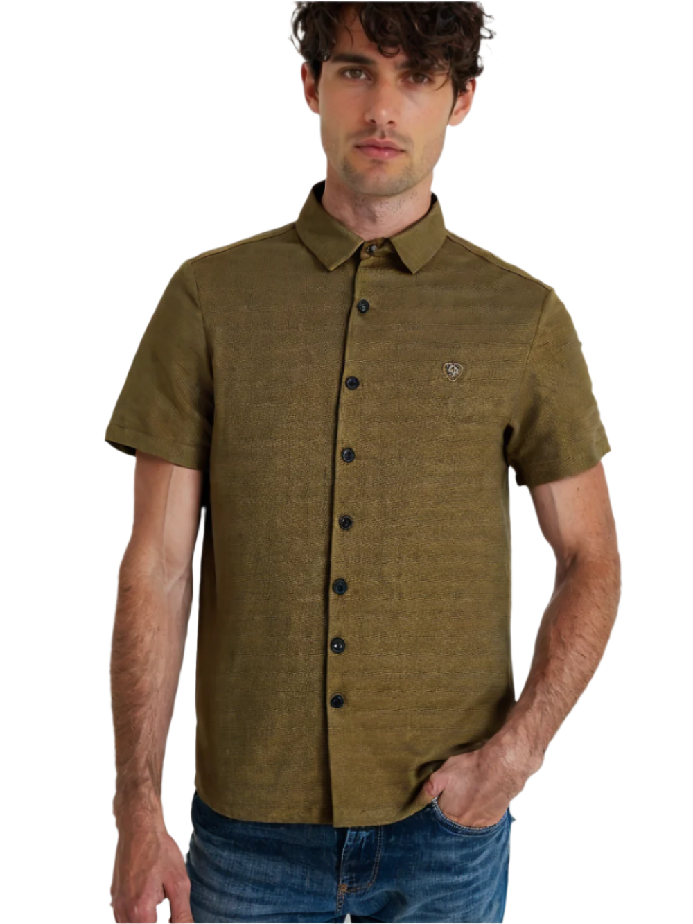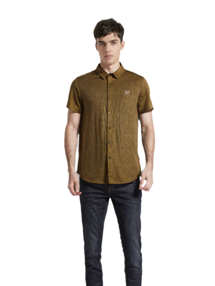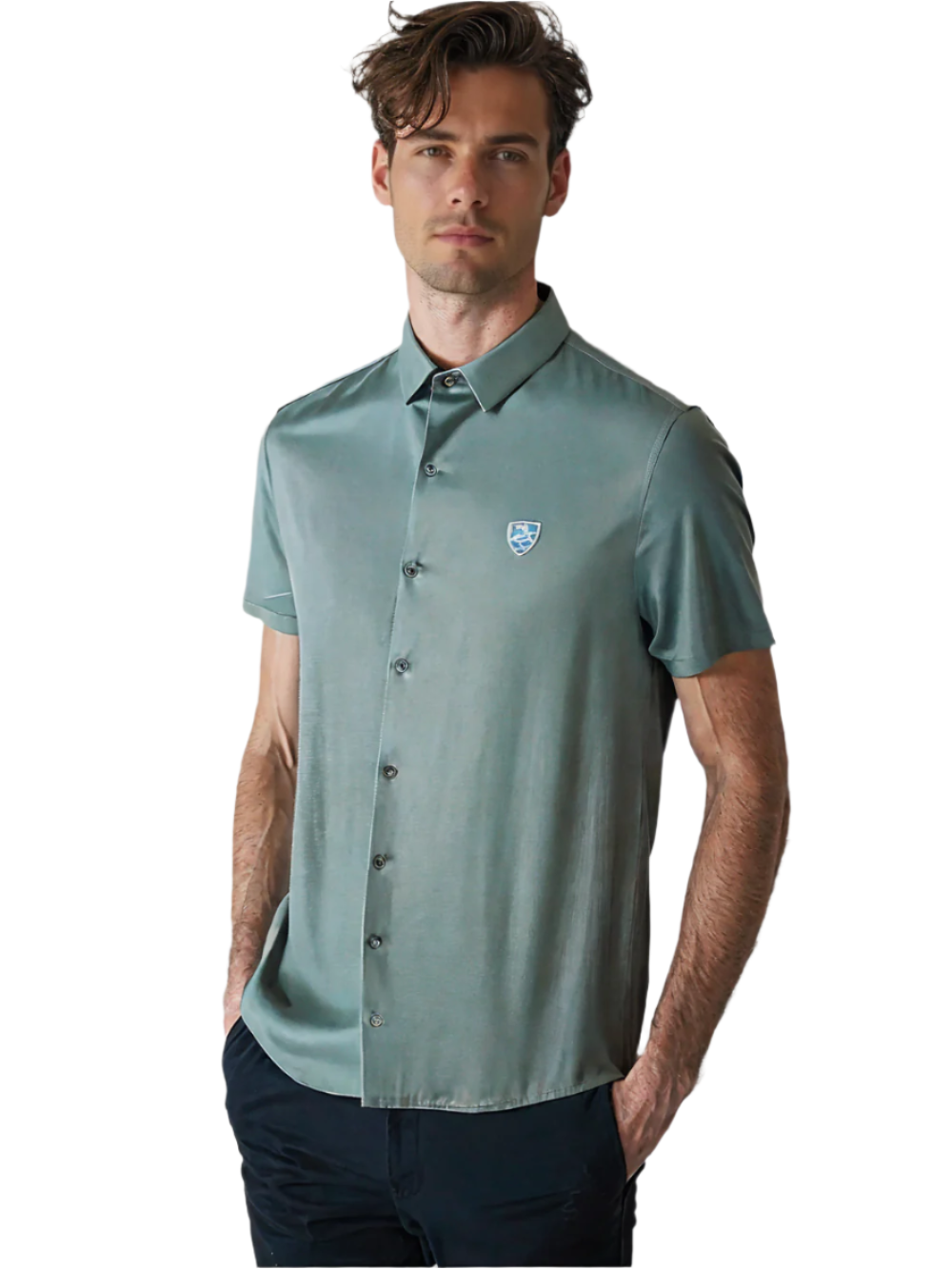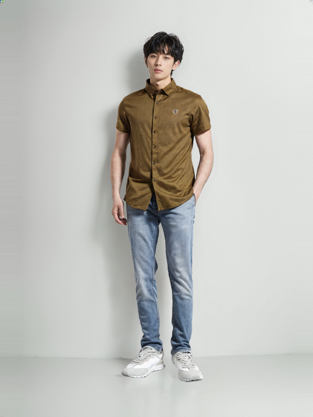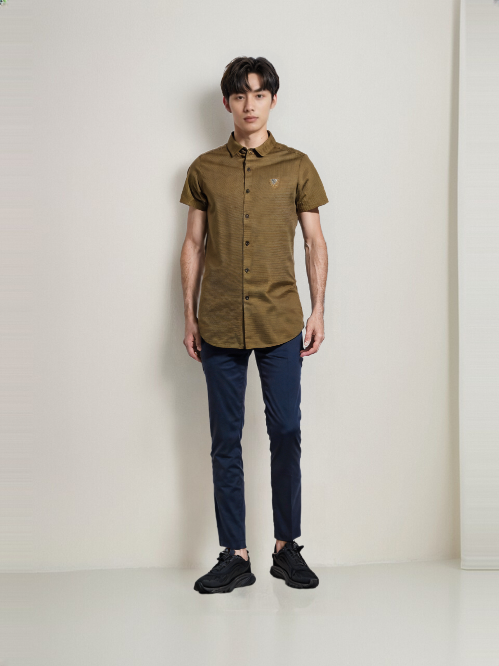 Step into effortless sophistication with this sharply tailored solid shirt. Designed for versatility, it features a sleek collar, clean lines, and a subtle embroidered chest emblem that adds just the right amount of distinction.