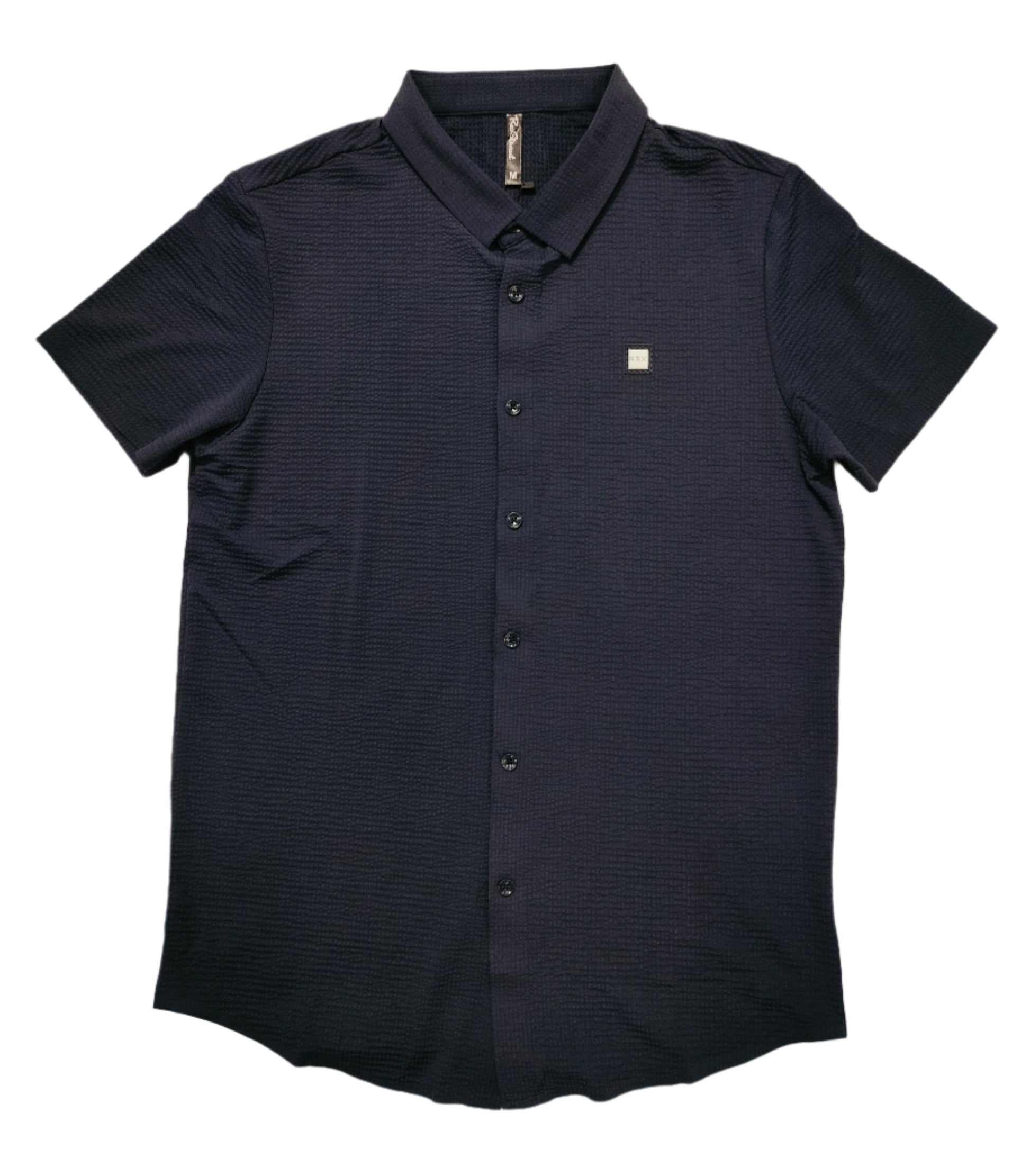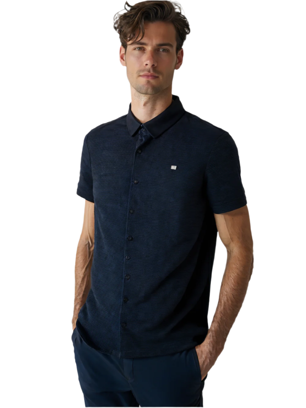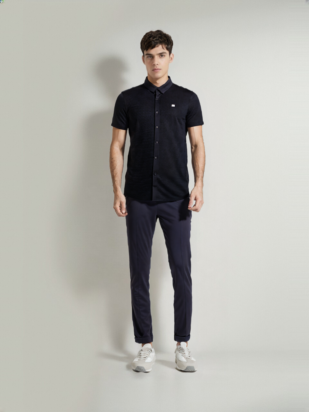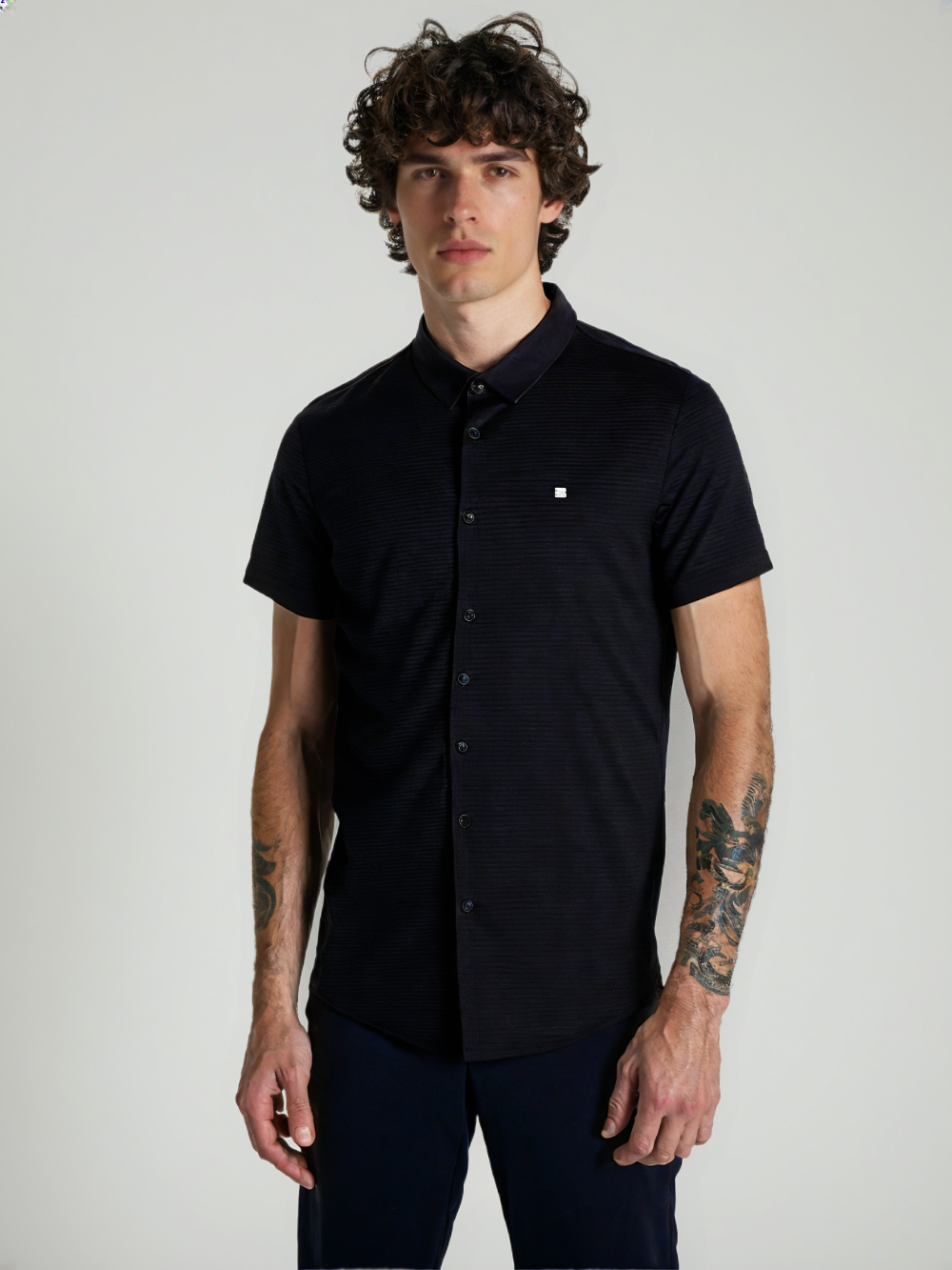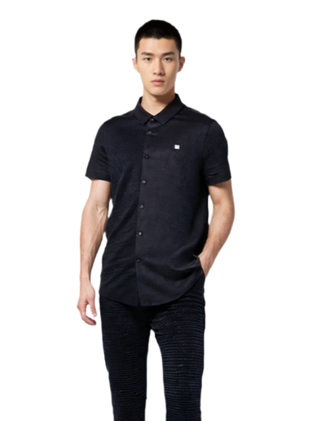 Stay sharp without overdoing it. This button-down shirt blends classic tailoring with modern subtlety, thanks to its rich textured fabric and sleek monochrome vibe. The discreet chest emblem adds just the right amount of detail, keeping the look elevated yet effortless.