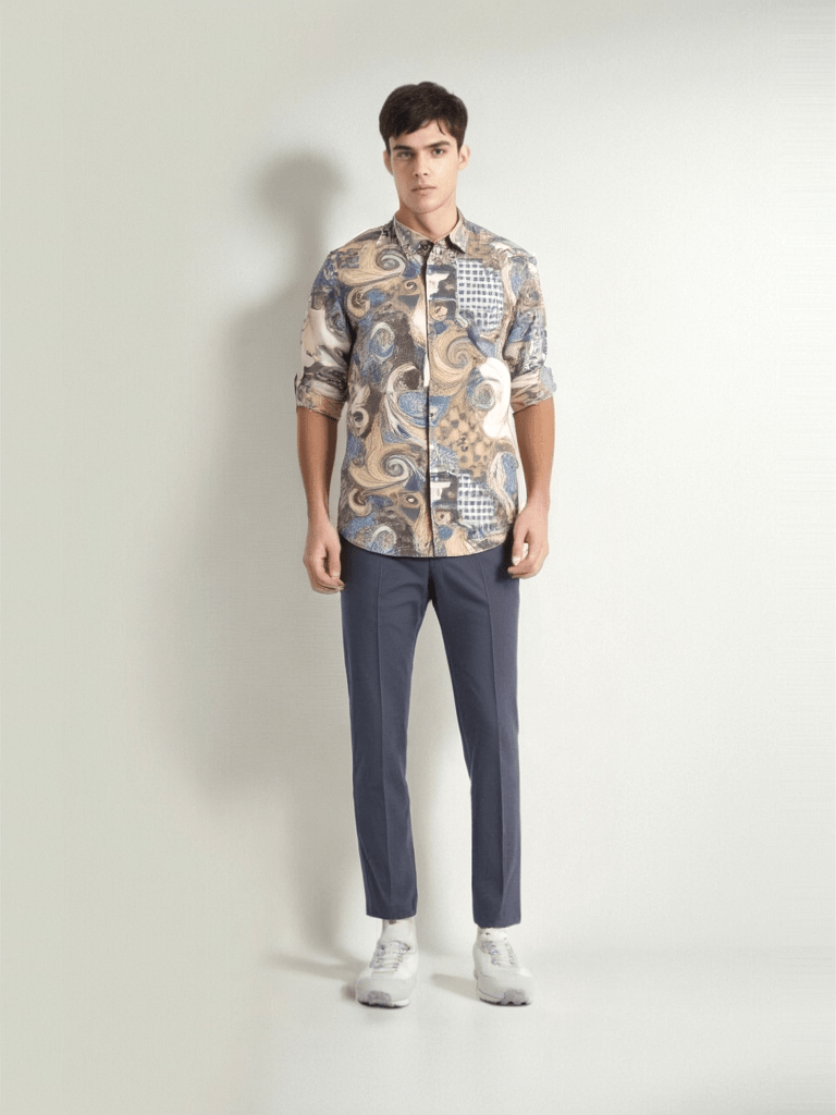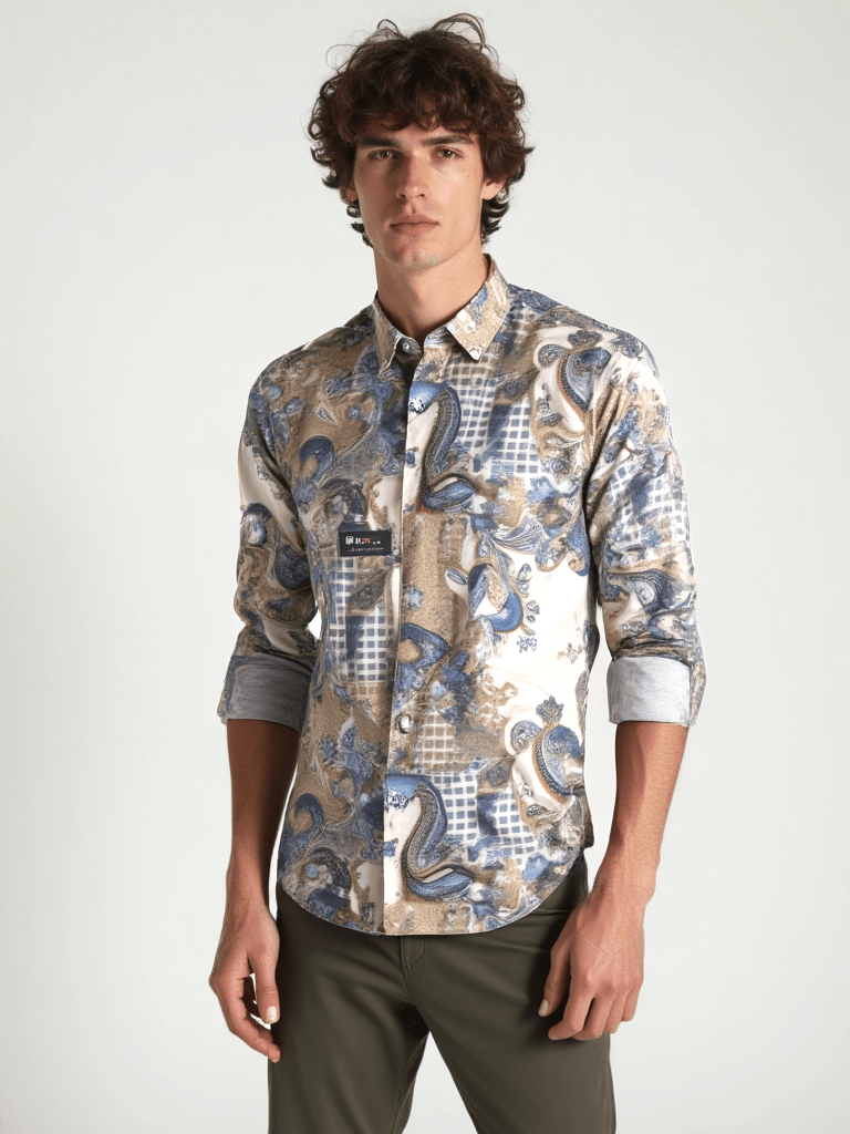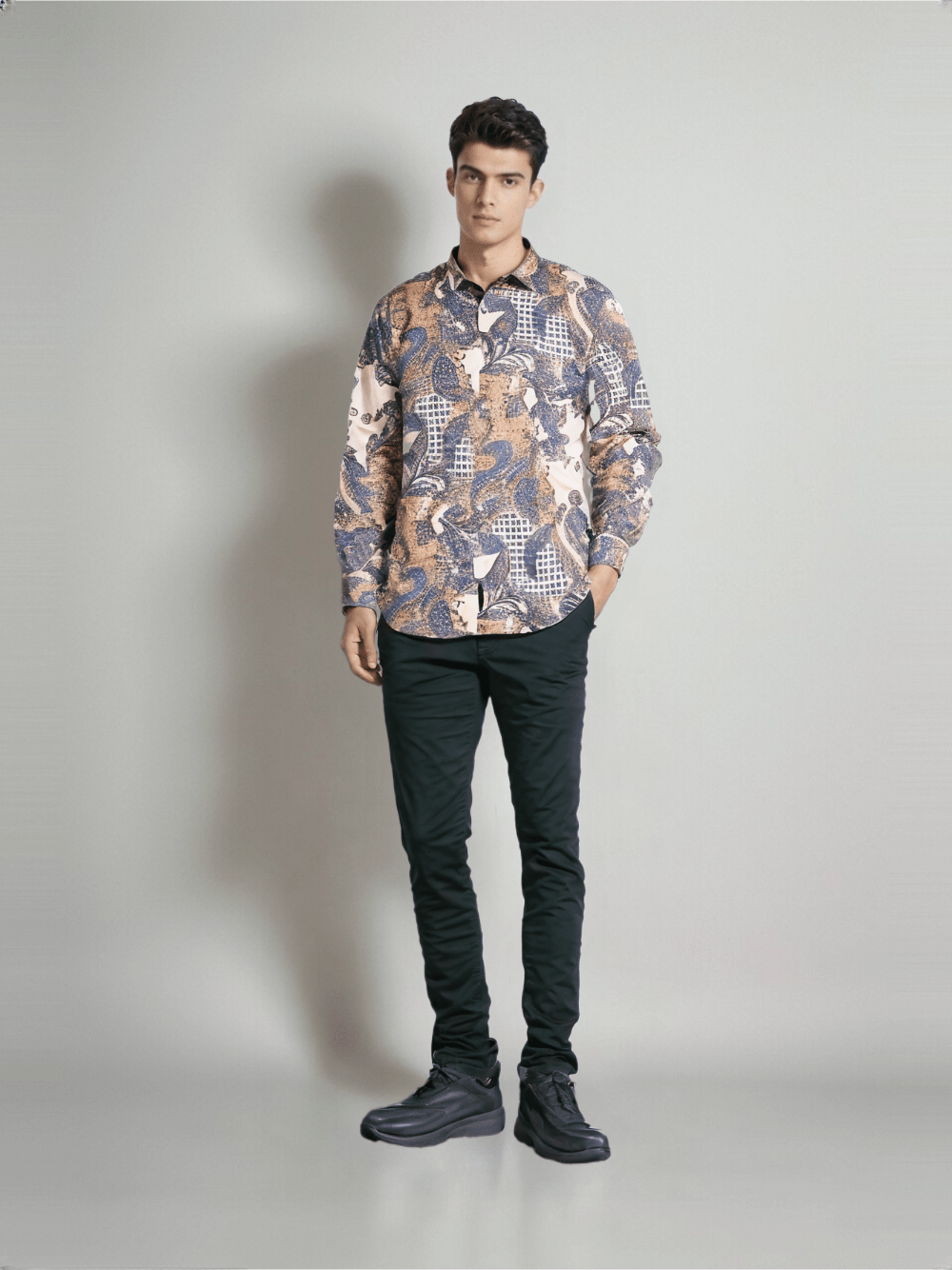 As an expert in the fashion industry, I present to you the RIVERBLUE Men's Fawn Printed Shirt. Made with the highest quality materials, this shirt features a unique fawn print that adds a touch of sophisticated style to any outfit. The perfect balance of comfort and design, this shirt is a must-have for any modern man.