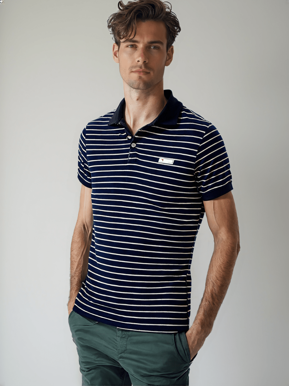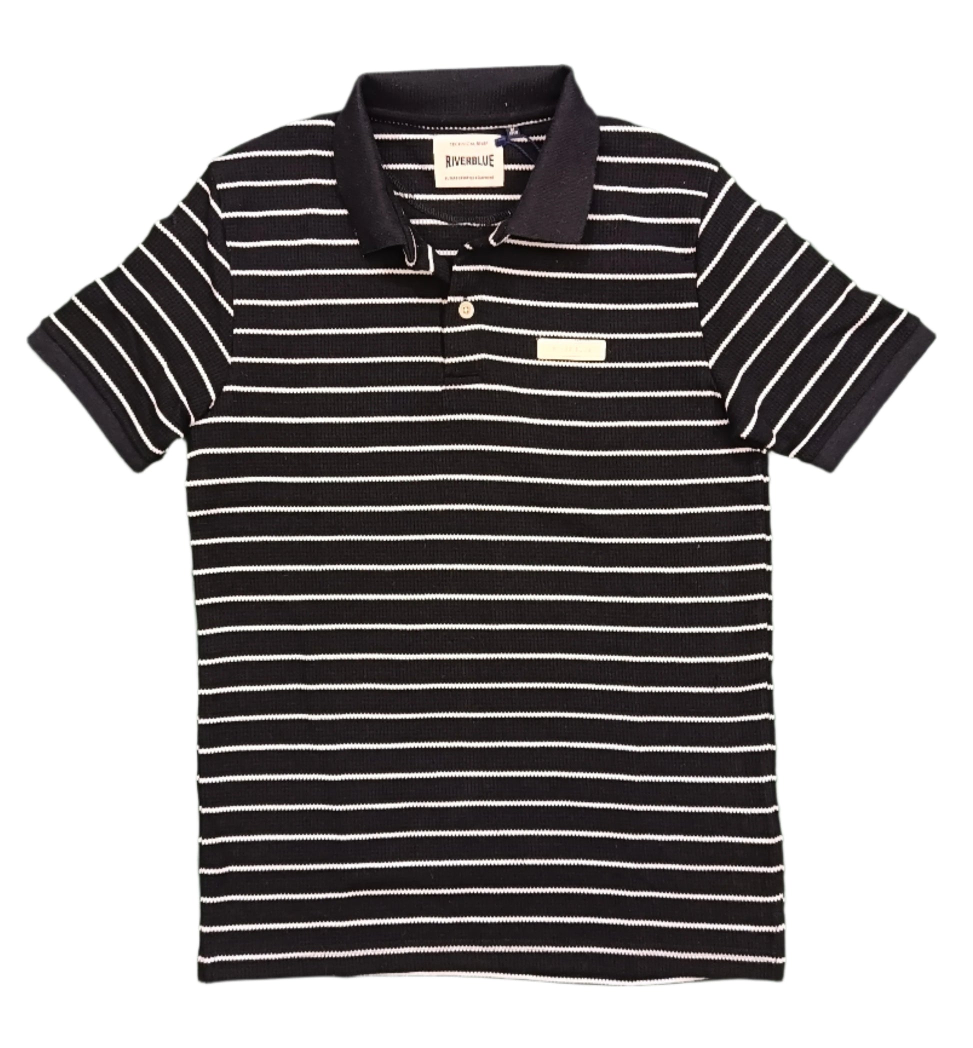 Introducing the RIVERBLUE Men's Black Striped T-shirt. Crafted with high-quality materials, this shirt features a stylish striped design and is perfect for any casual occasion. The breathable fabric ensures all-day comfort, while the classic black color adds a touch of elegance to your wardrobe. Upgrade your style game with this must-have piece.