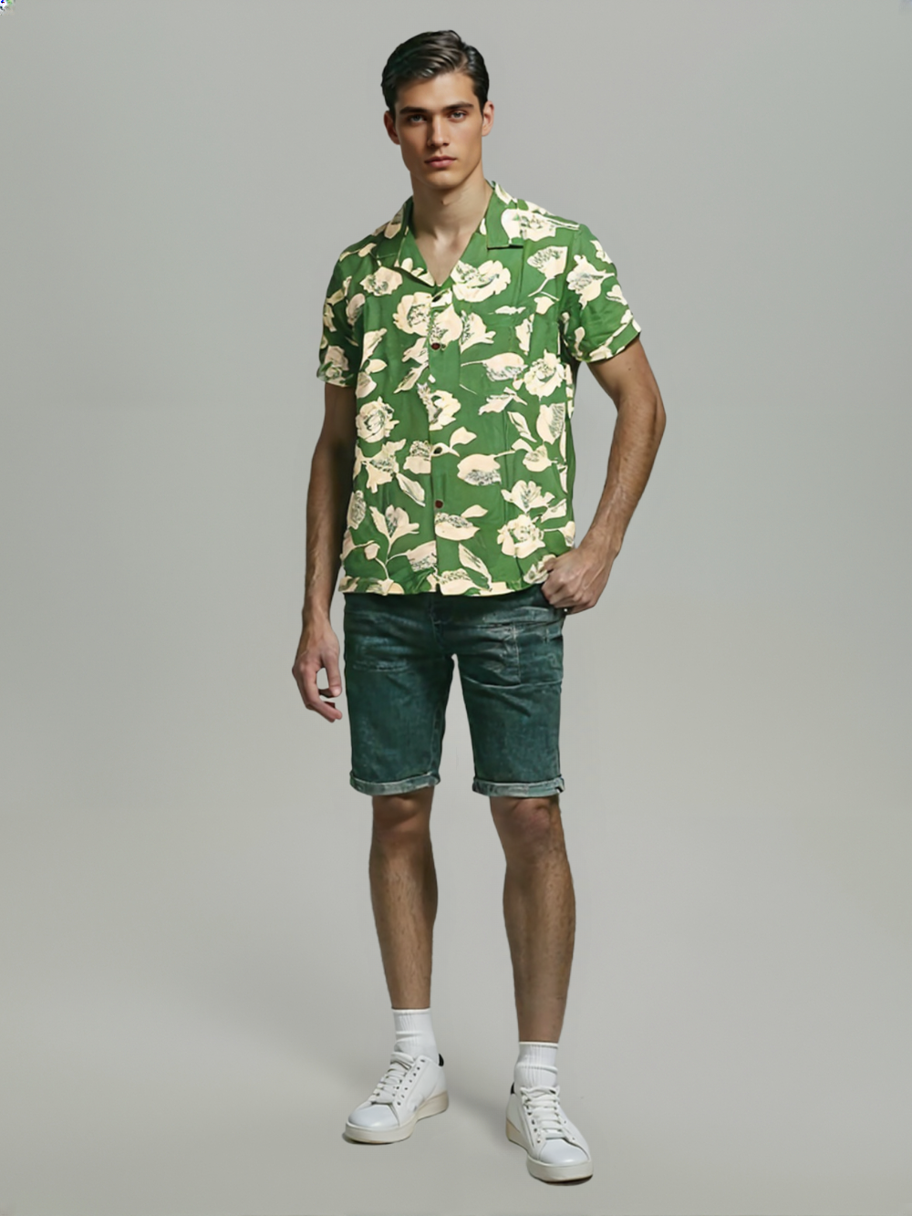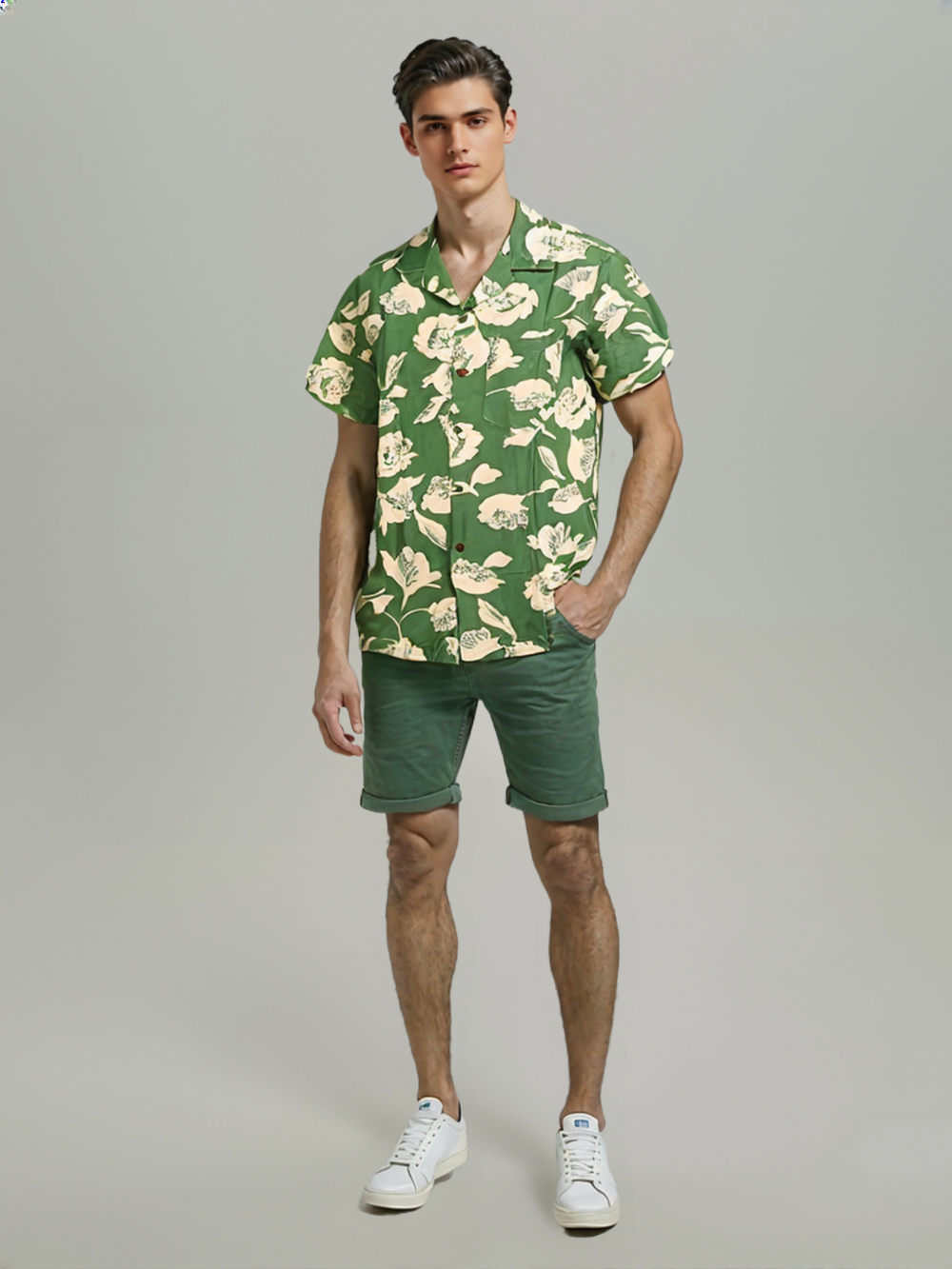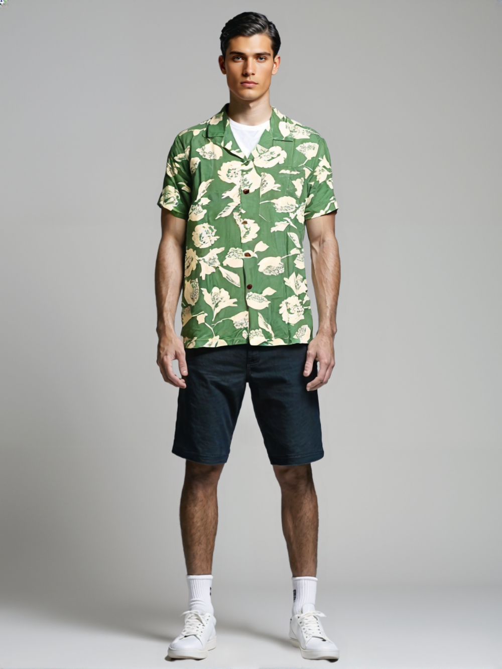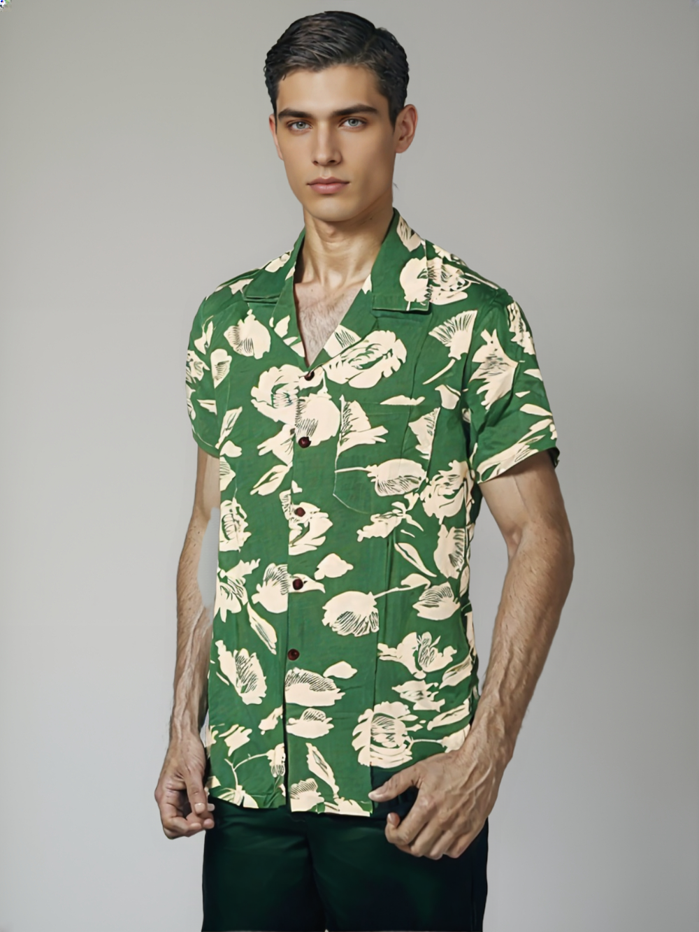 The Men's Leaf Me Wild Summer Print Shirt captures the essence of the season with its vibrant leaf-inspired design. Made from lightweight, breathable fabric, it ensures comfort during warm days while adding a bold, nature-inspired statement to your look. Its relaxed fit and stylish print make it an ideal choice for casual outings, beach trips, or summer gatherings, blending effortless style with seasonal freshness.