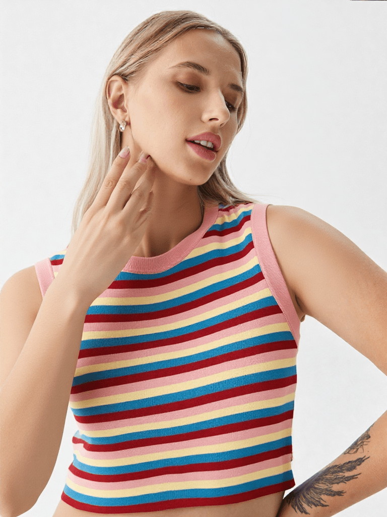 This Women's Top offers a comfortable knitted fabric with a stylish sleeveless design and eye-catching stripes. Perfect for online customers, it provides a flattering fit and versatile style for any occasion. Upgrade your wardrobe with this must-have top.