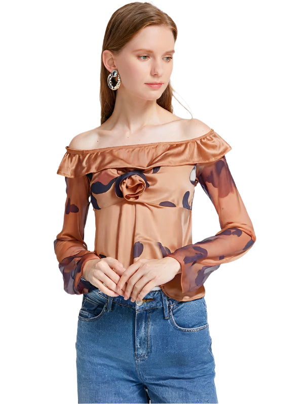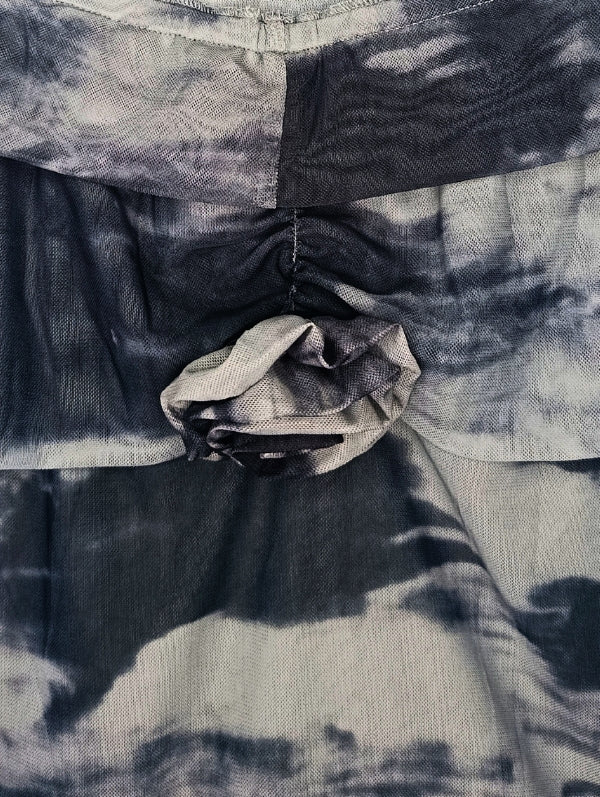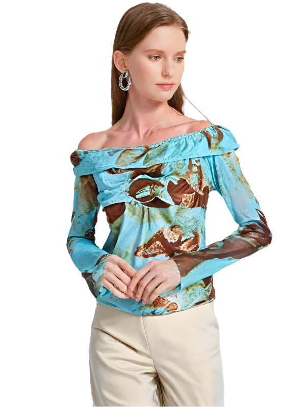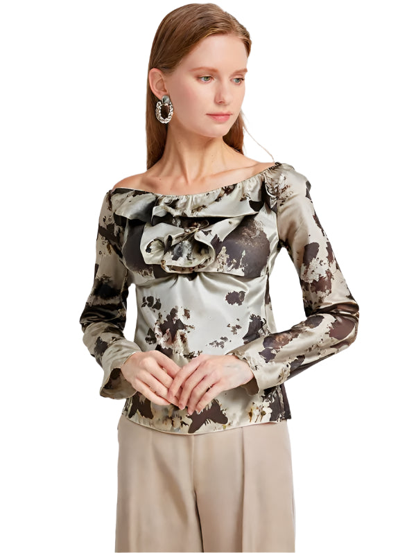 Expertly crafted with CHIFONE fabric, this women's crop top boasts a unique printed design and flared sleeves. Enjoy the comfort and style of this chic top, perfect for any occasion. Elevate your wardrobe with this elegant and versatile piece.