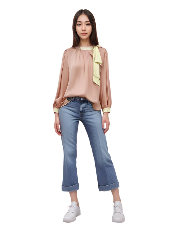 This women's top features a round neck and a flattering flair design, crafted from a comfortable cotton blend fabric. Perfect for everyday wear, this top combines style and comfort seamlessly. Elevate your wardrobe with this must-have piece.